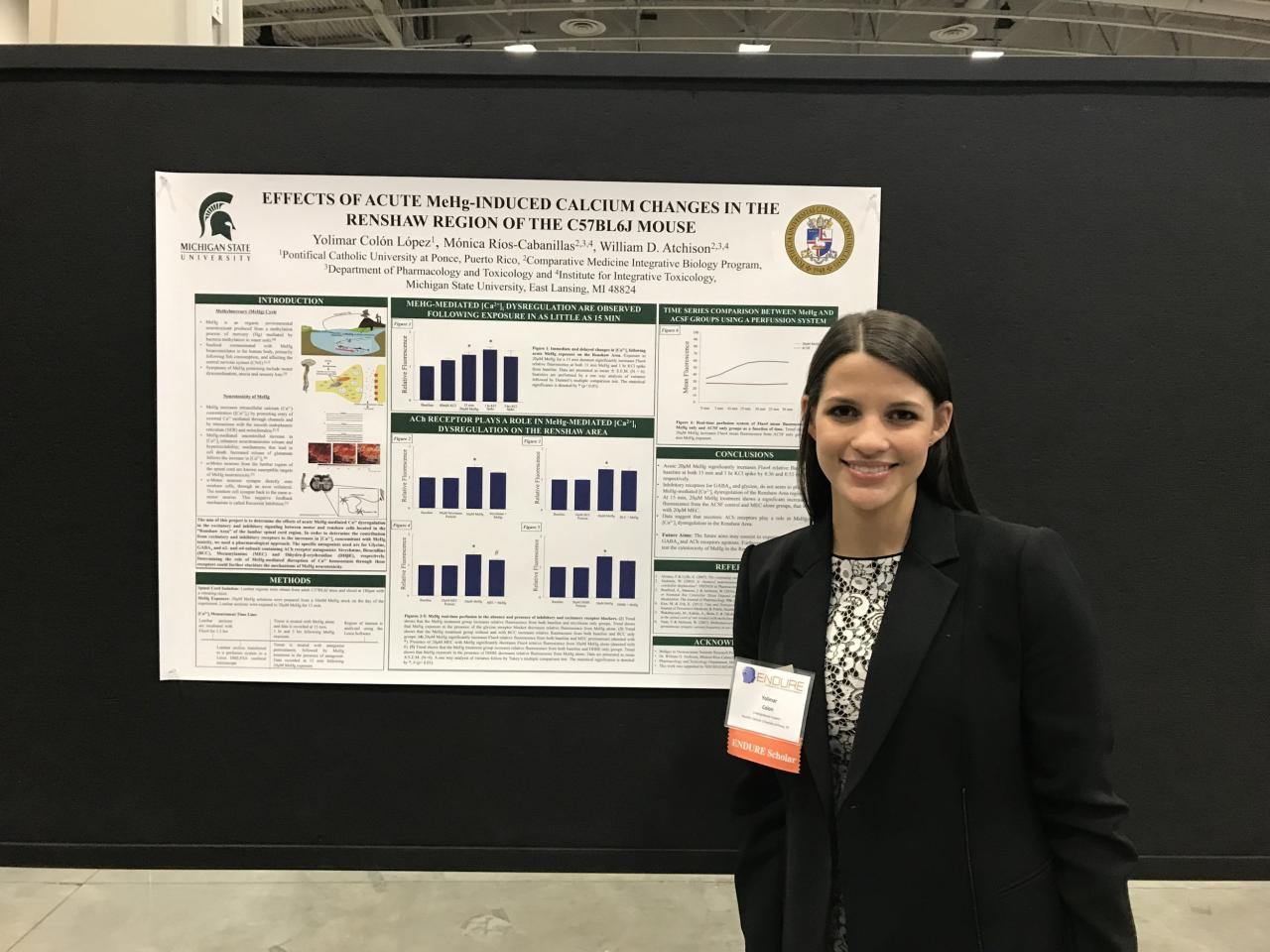 Yolimar presentó su proyecto Effect of Acute MeHg-Induced Calcium Changes in the Renshaw Region of the C57BLG6J Mouse.  Esto, bajo la mentoría  de Mónica Ríos, estudiante de postgrado, junto con el Dr. William D. Atchison.