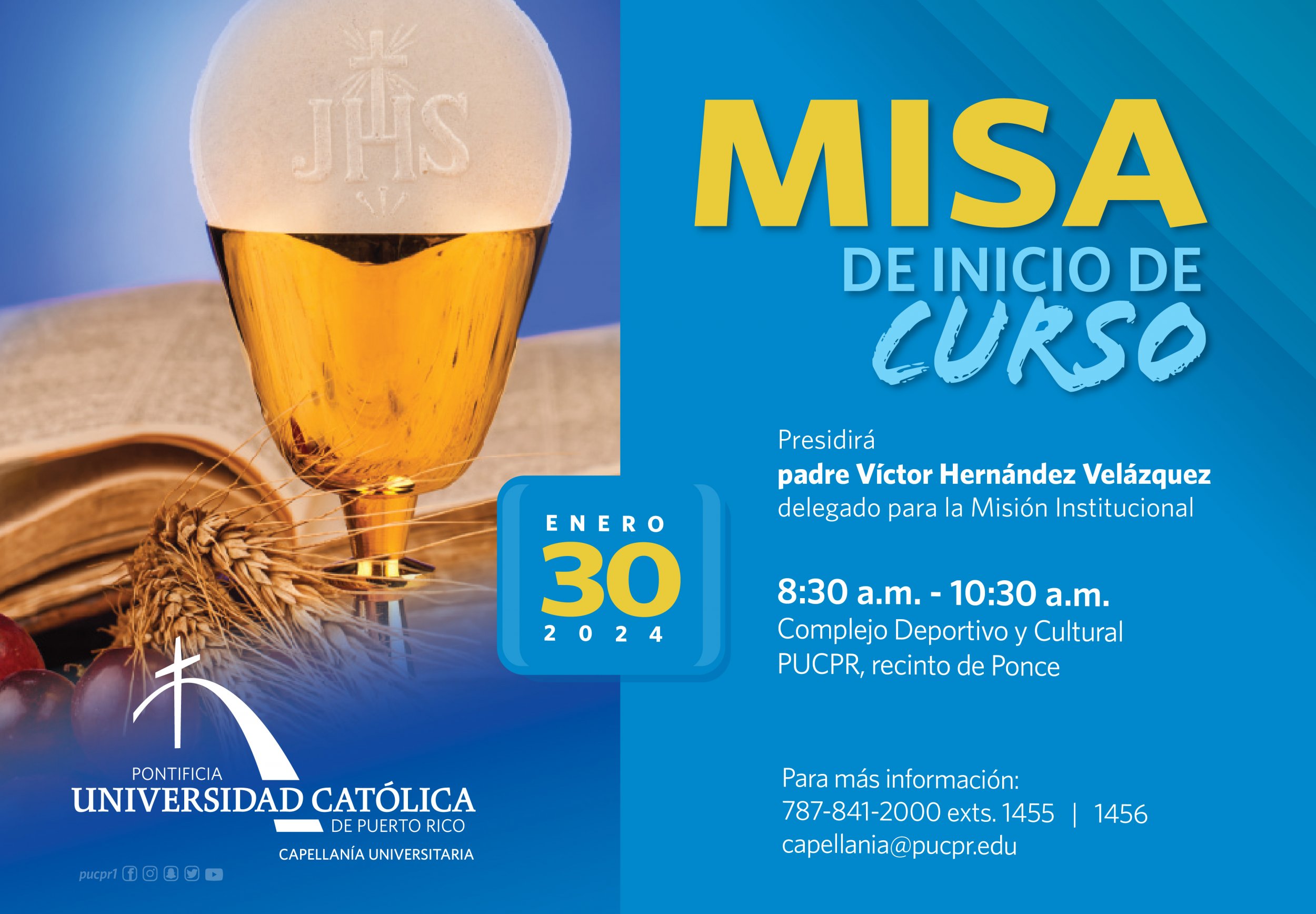 “Iniciemos este curso con alegría y gratitud a Dios por la oportunidad de reencontrarnos en nuestra Universidad” By celimer_torres@pucpr.edu | January 25, 2024 Te invitamos a la Misa de Inicio de Curso Posted in General ← Vigente el impacto internacional de la Escuela para Cuidadores de Adultos MayoresHerencia canaria en Puerto Rico →