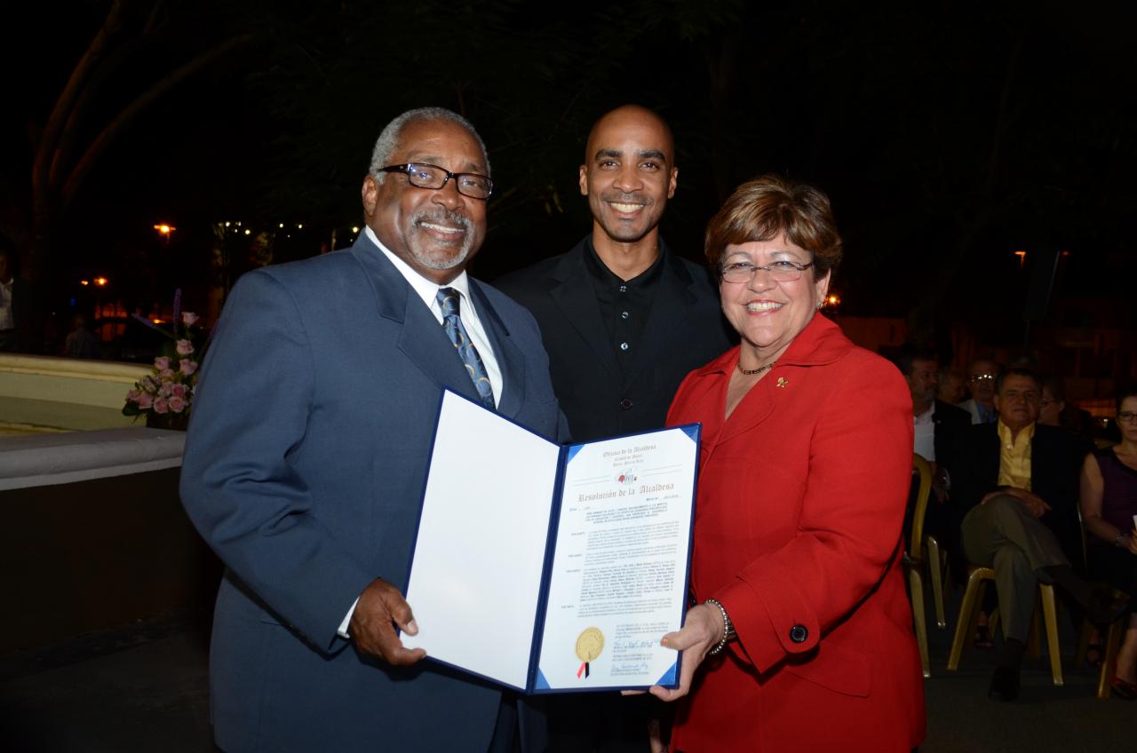 El Maestro Rubén Colón Tarrats recibió una Resolución del Municipio de Ponce como “Ponceño Ilustre”. El Director Coral sonríe junto a su hijo, Rubén Colón y la Alcaldesa.