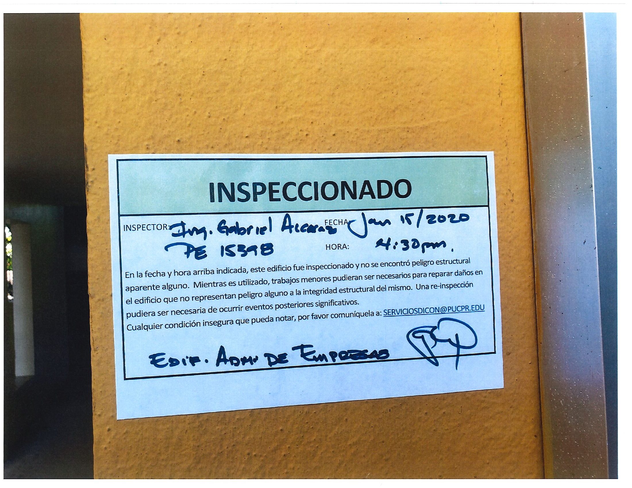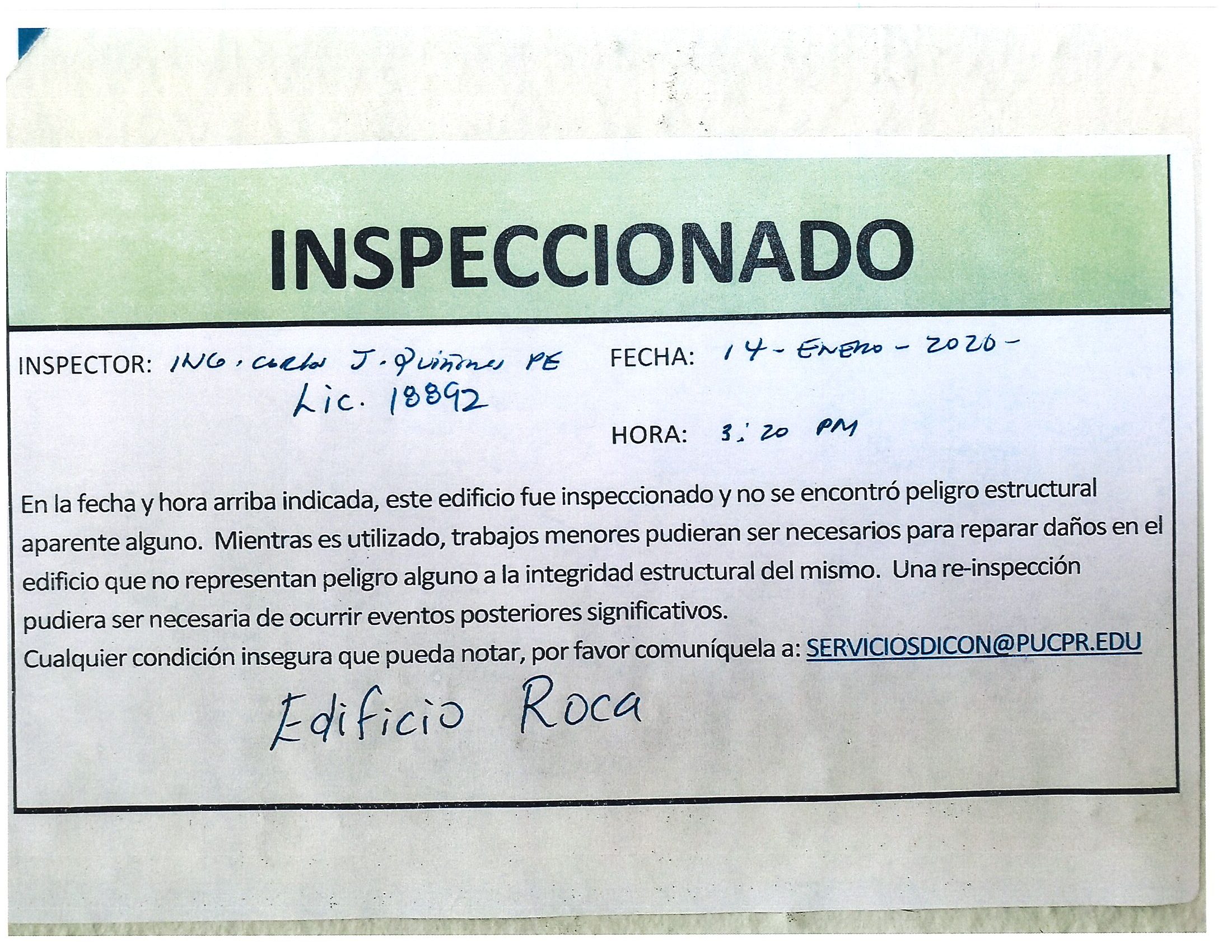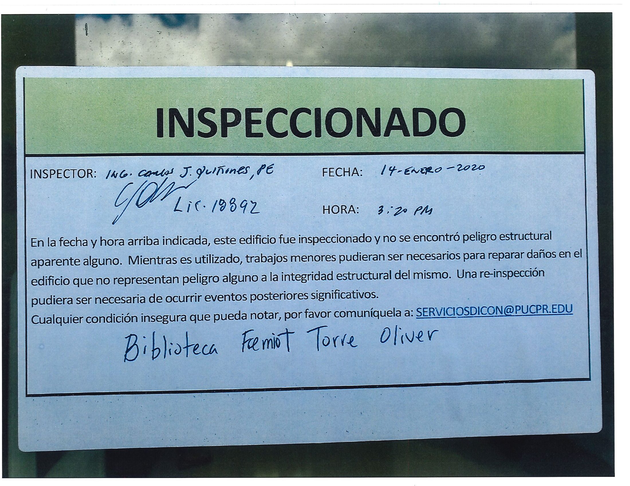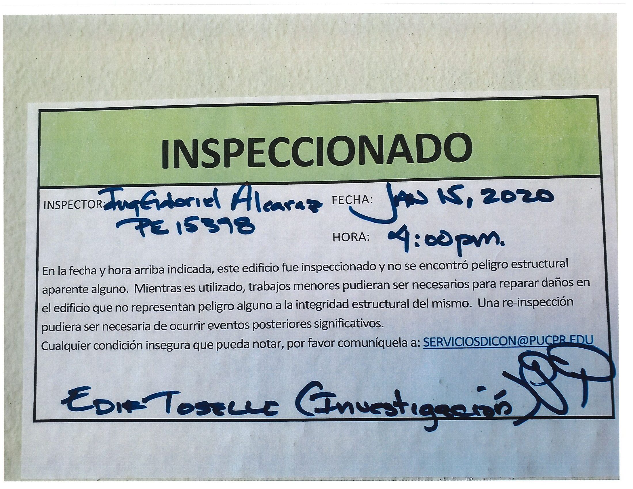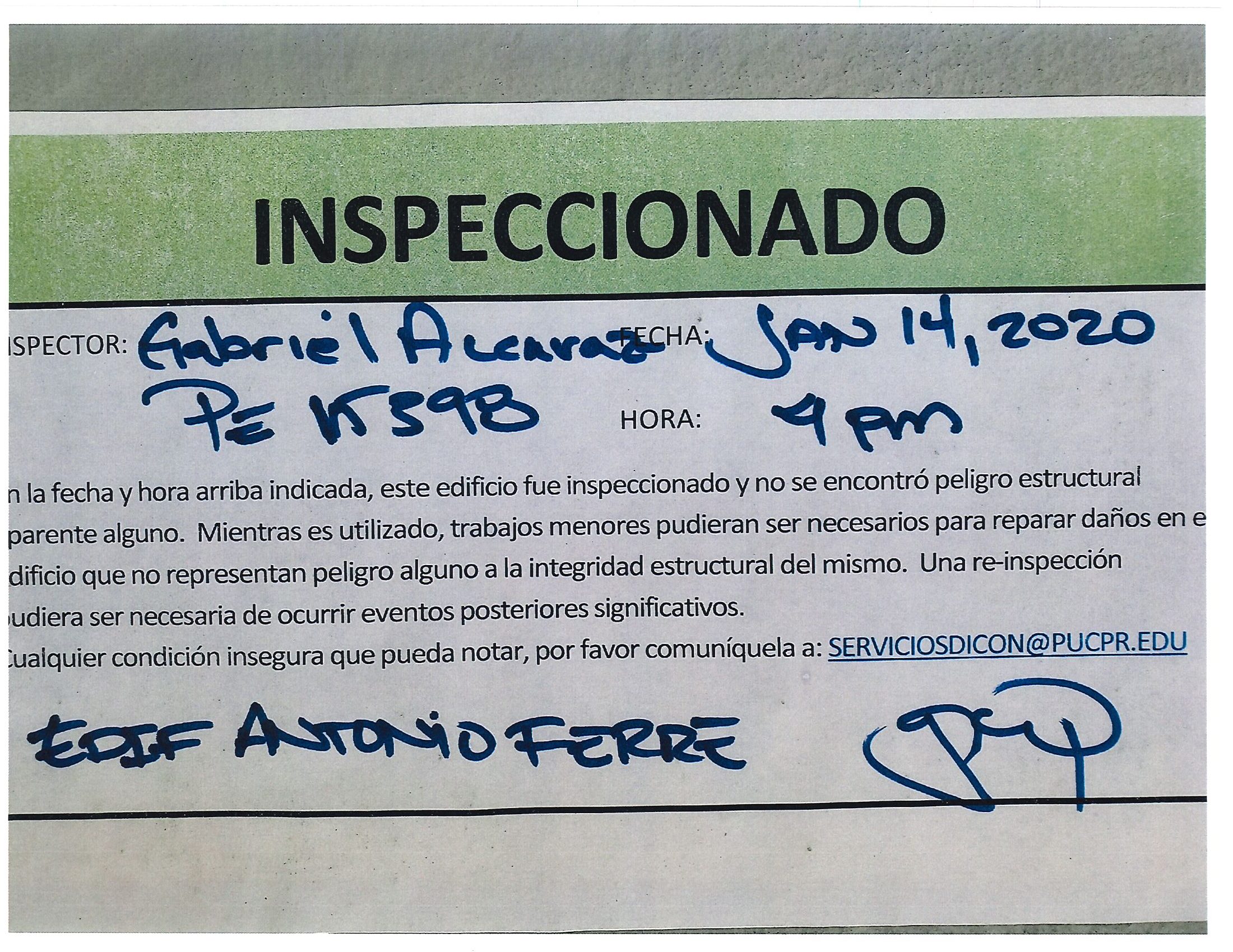 Actualización de inspección de los edificios By celimer_torres@pucpr.edu | January 20, 2020 Estos edificios están aptos para su uso. Posted in General ← Inicia proceso de matrícula en los tres recintosEn manos Pioneras la reconstrucción de la zona sur. →