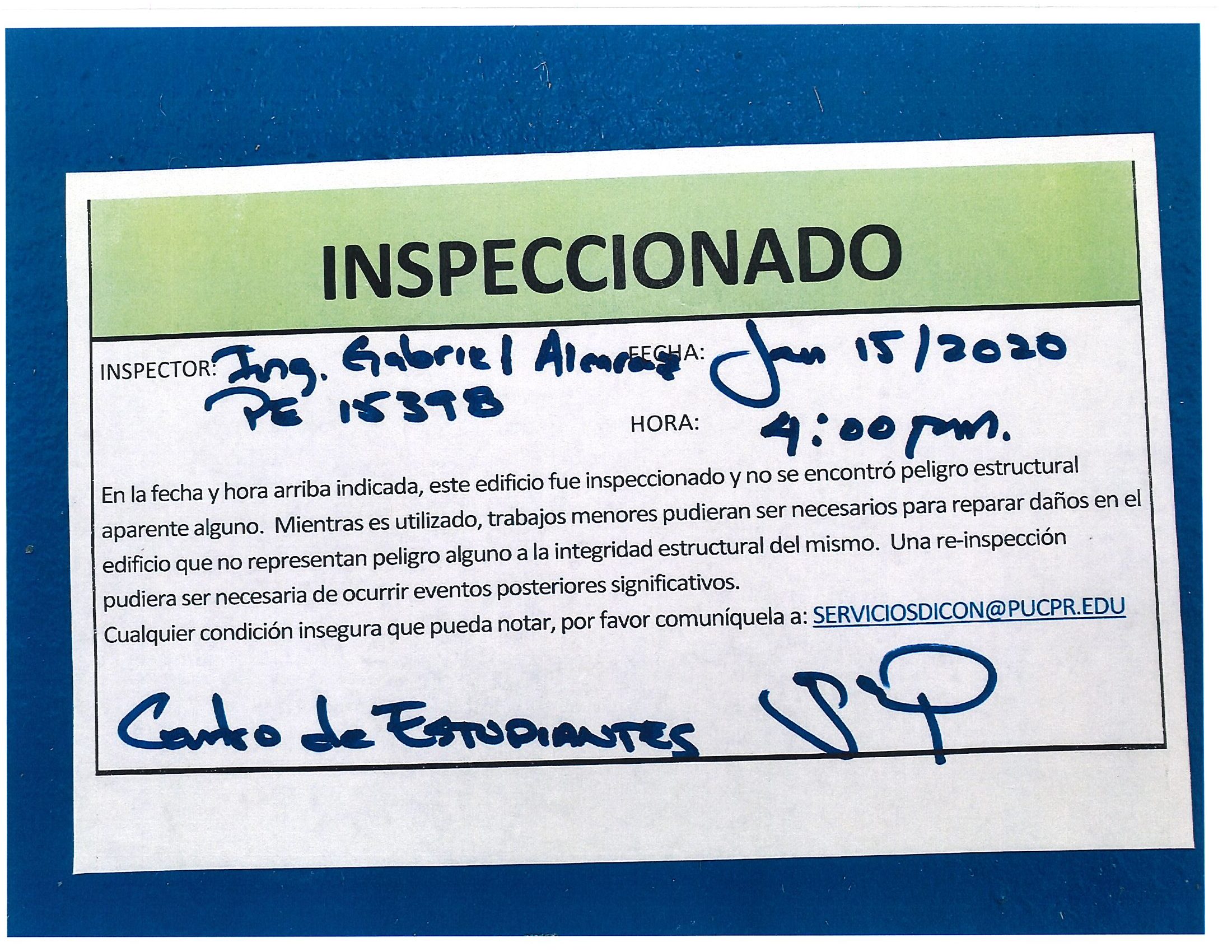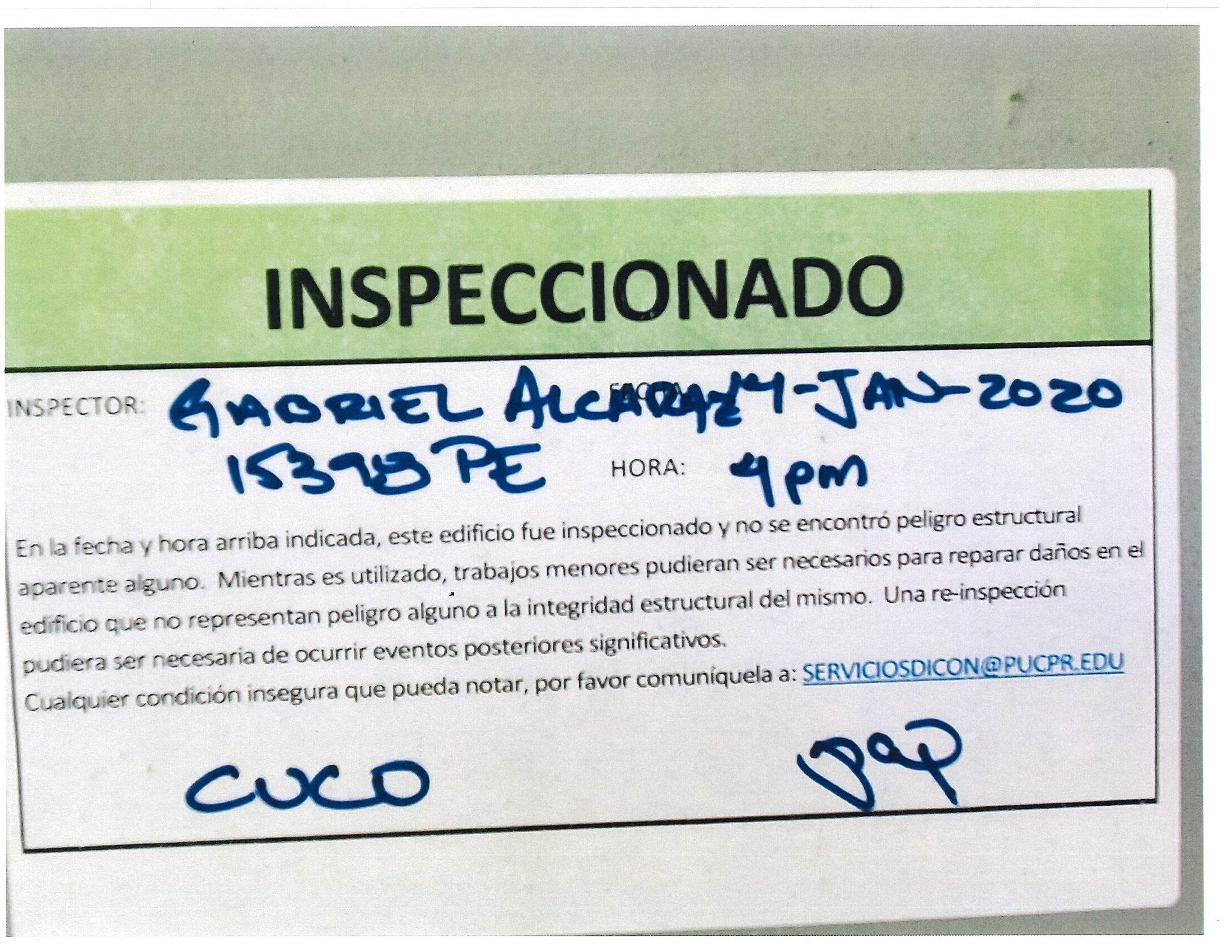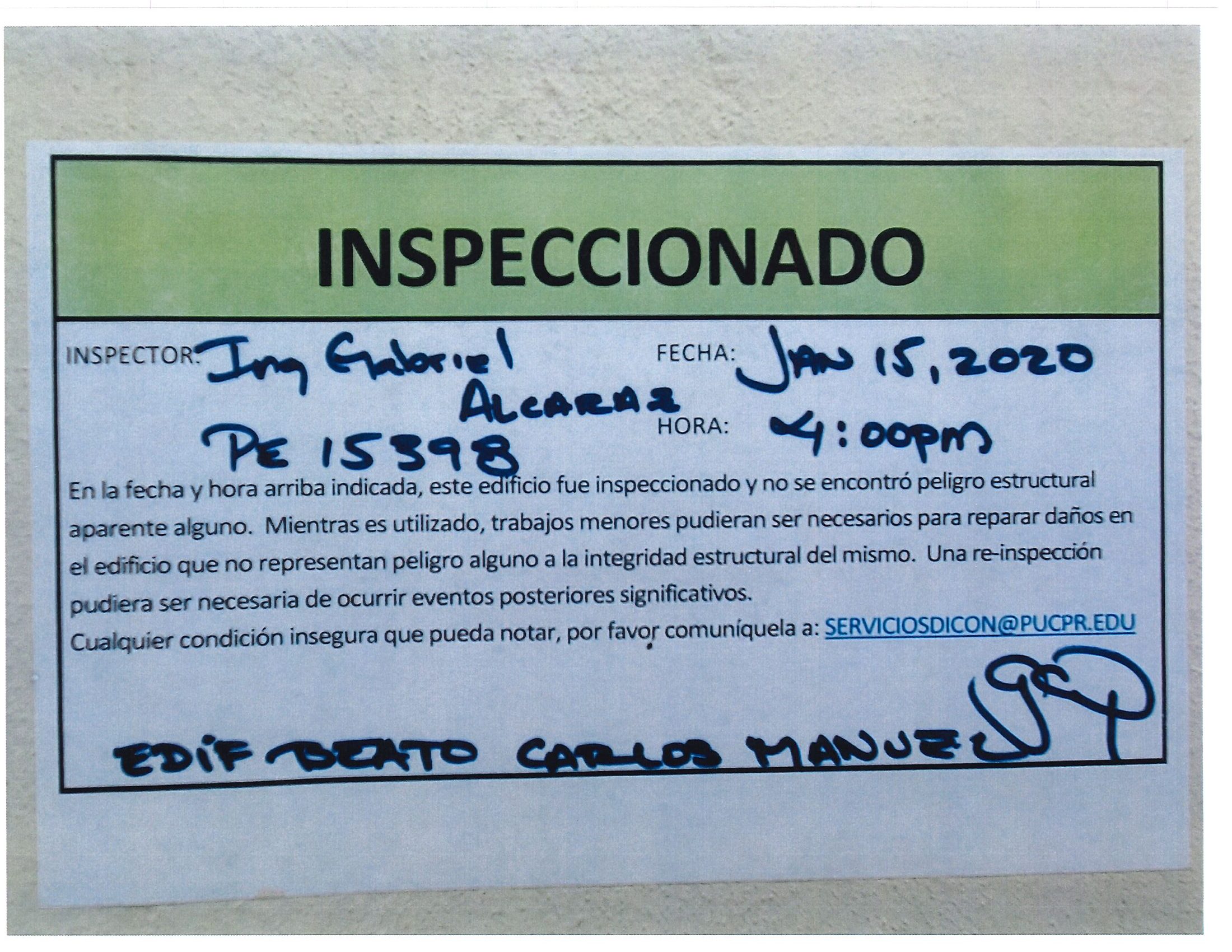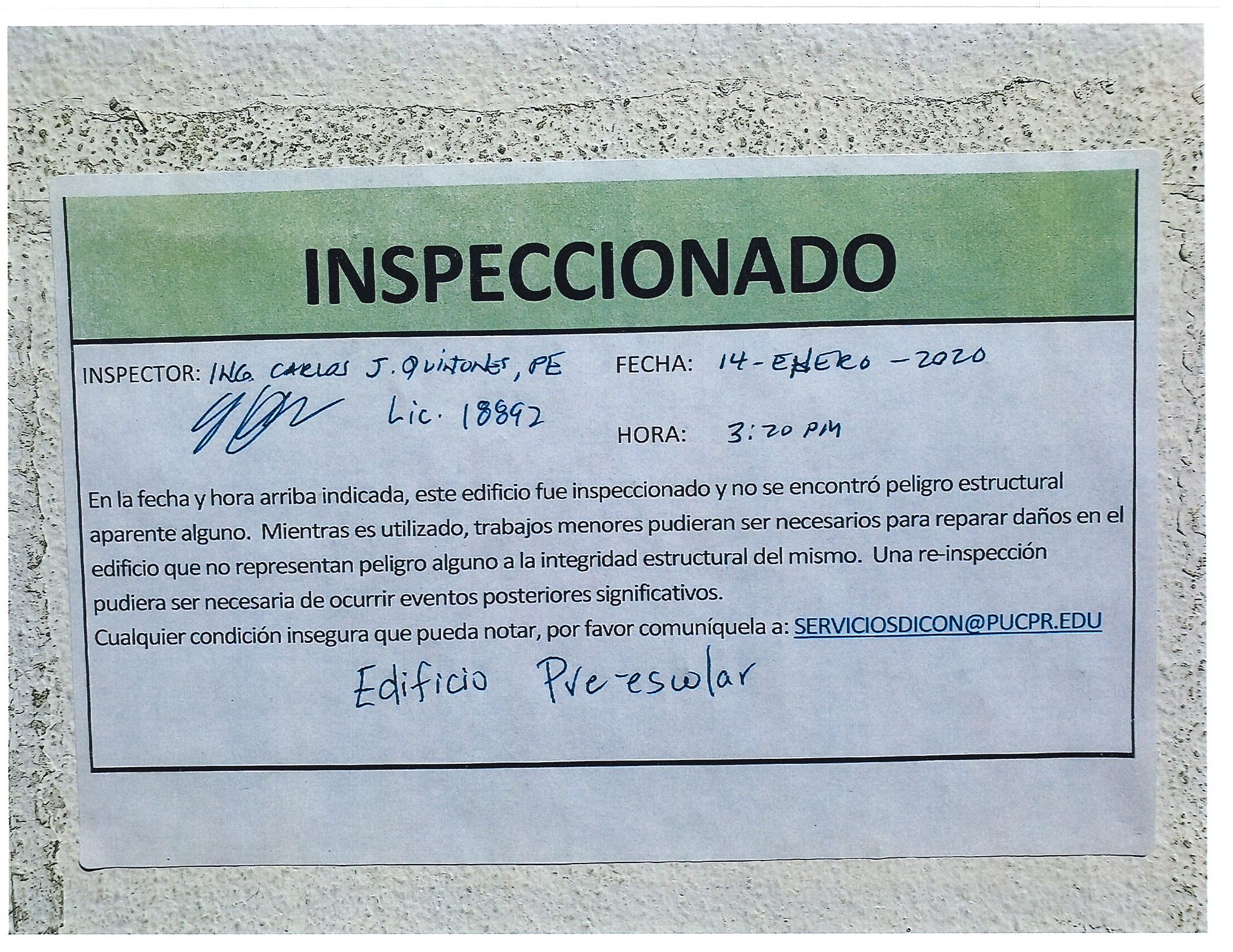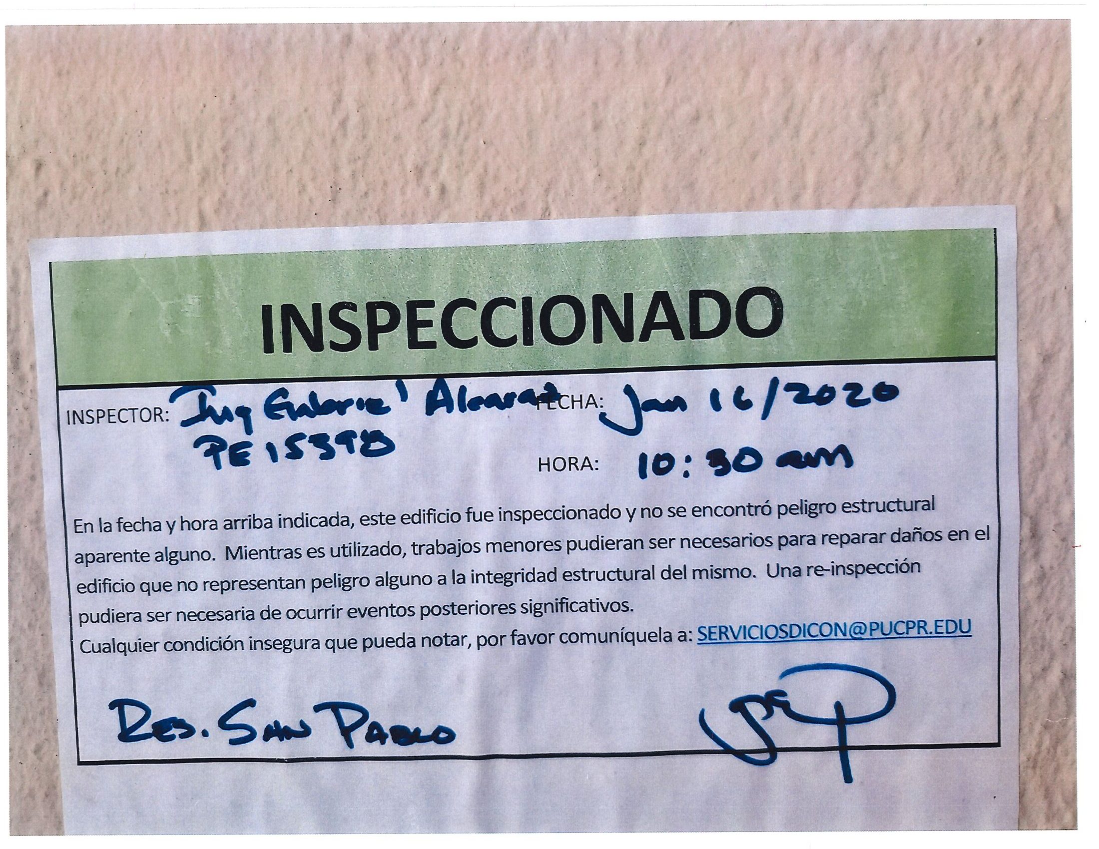 Actualización de inspección de los edificios By celimer_torres@pucpr.edu | January 20, 2020 Estos edificios están aptos para su uso. Posted in General ← Inicia proceso de matrícula en los tres recintosEn manos Pioneras la reconstrucción de la zona sur. →