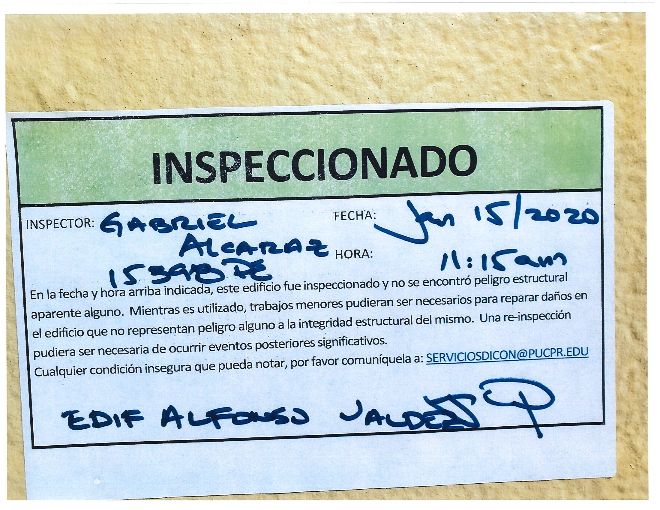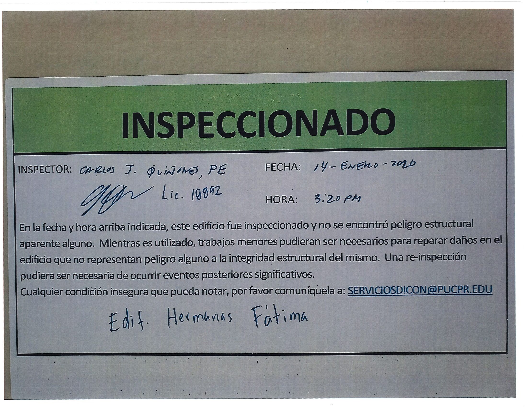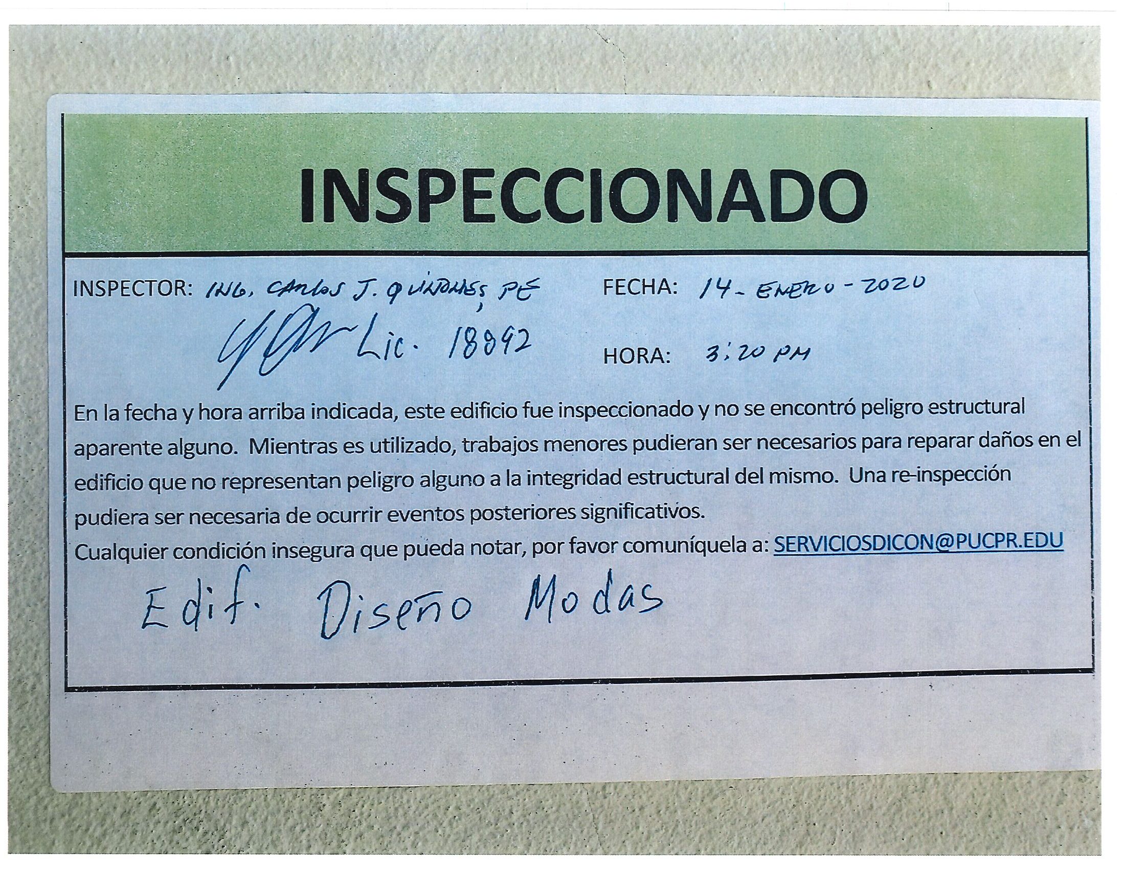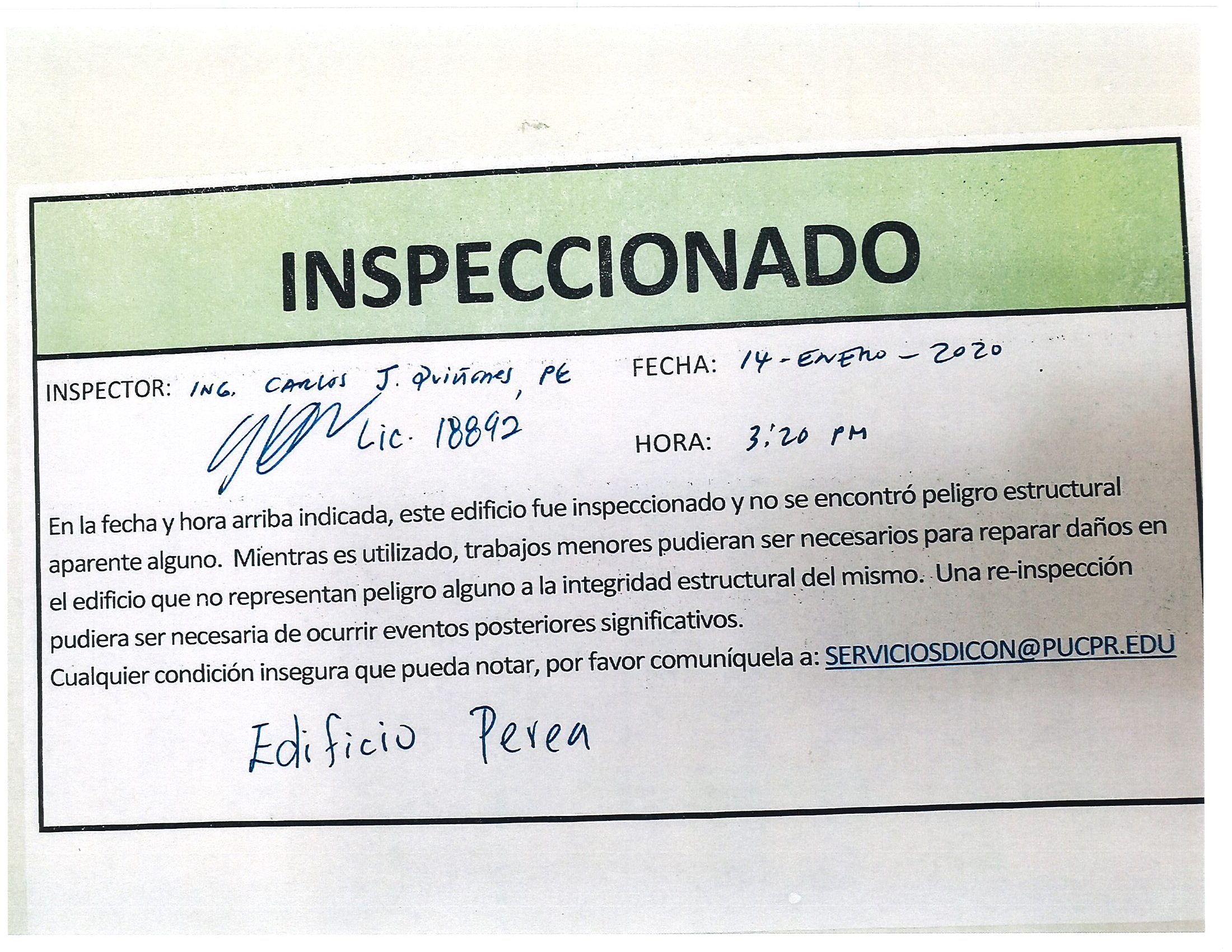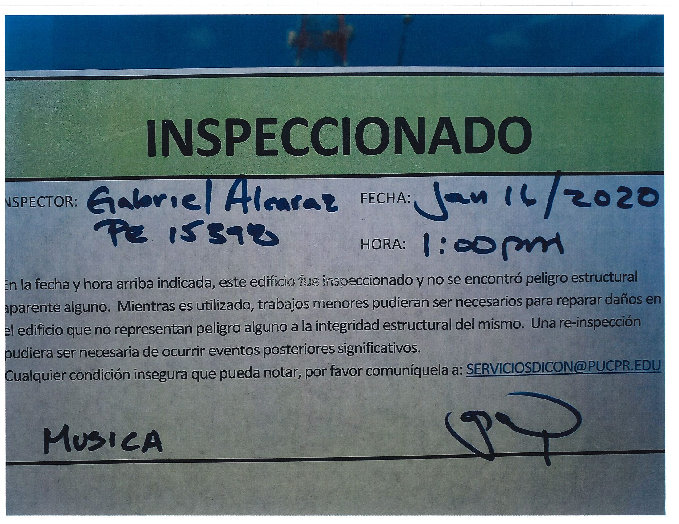 Actualización de inspección de los edificios By celimer_torres@pucpr.edu | January 20, 2020 Estos edificios están aptos para su uso. Posted in General ← Inicia proceso de matrícula en los tres recintosEn manos Pioneras la reconstrucción de la zona sur. →