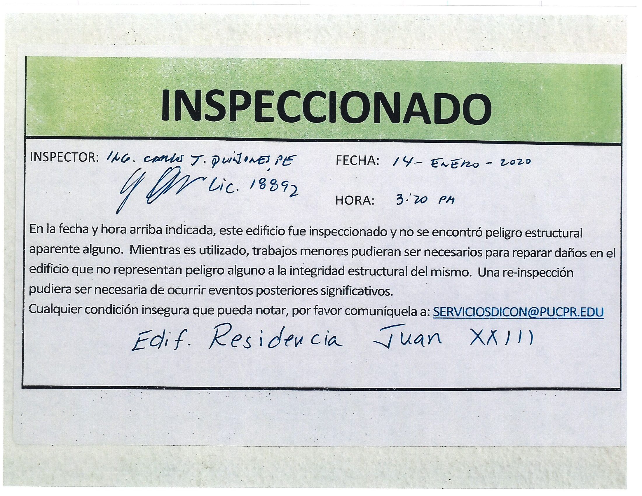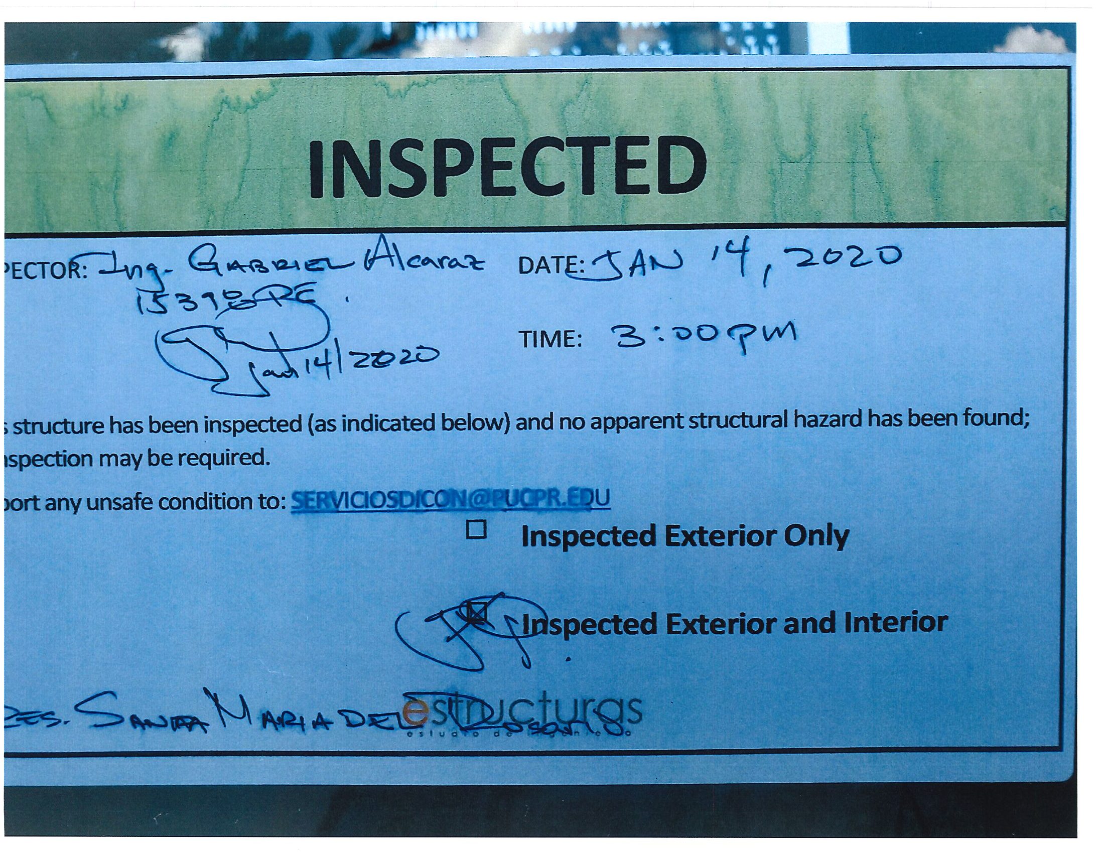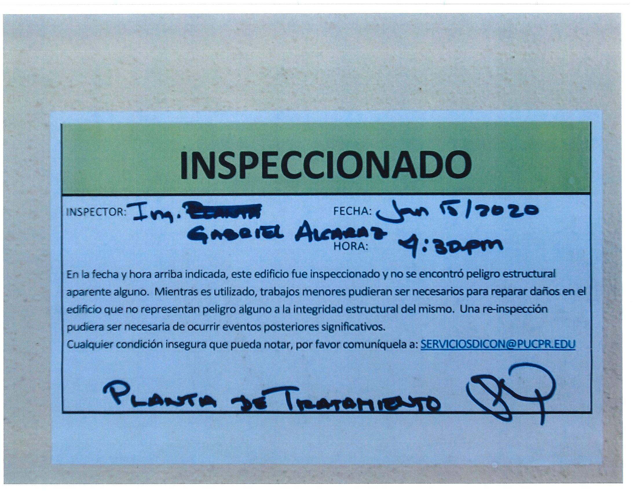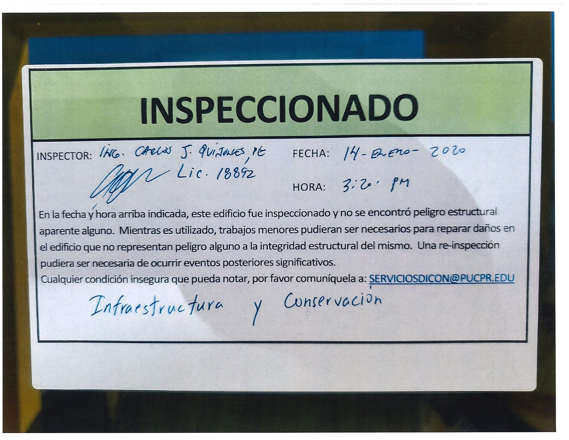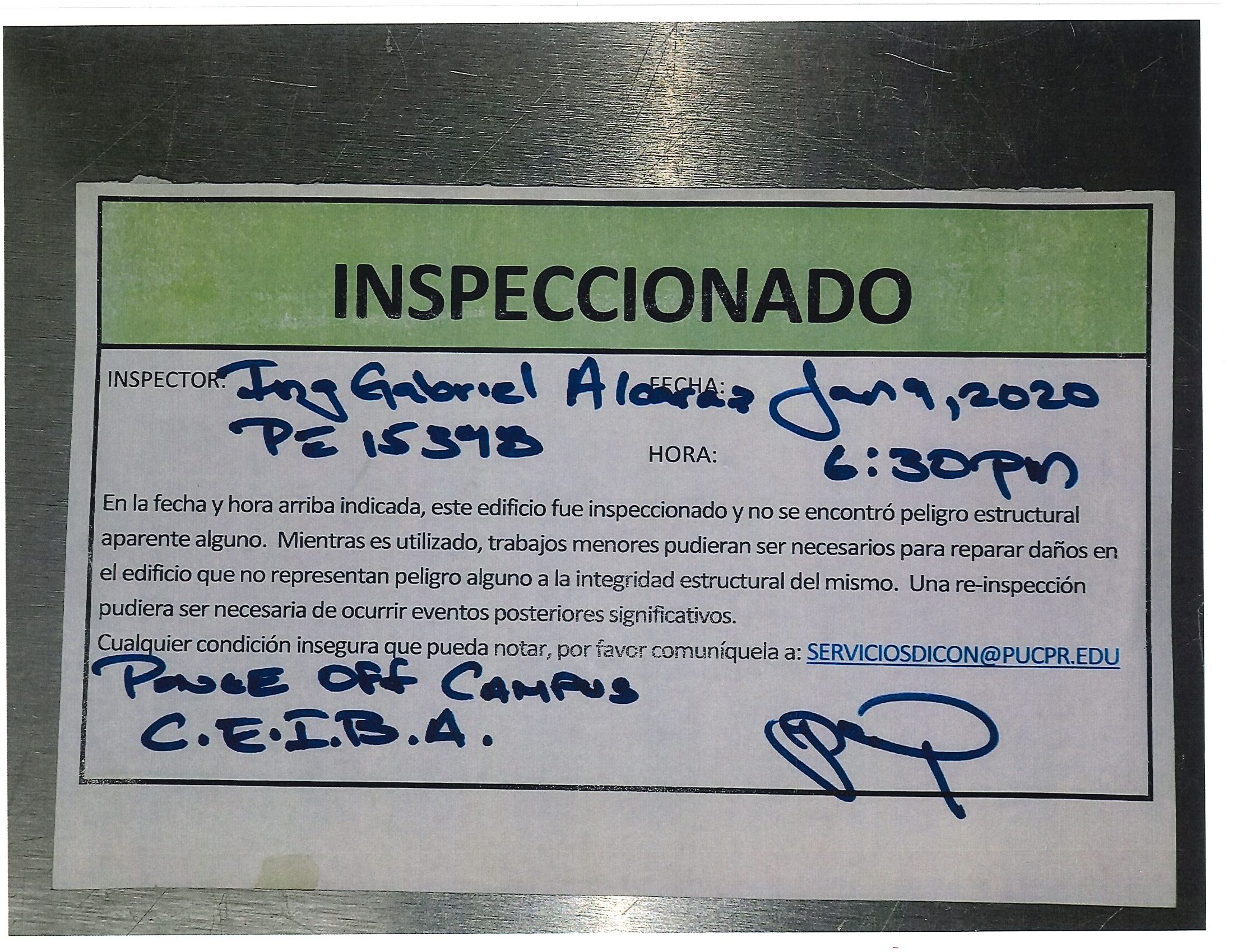 Actualización de inspección de los edificios By celimer_torres@pucpr.edu | January 20, 2020 Estos edificios están aptos para su uso. Posted in General ← Inicia proceso de matrícula en los tres recintosEn manos Pioneras la reconstrucción de la zona sur. →