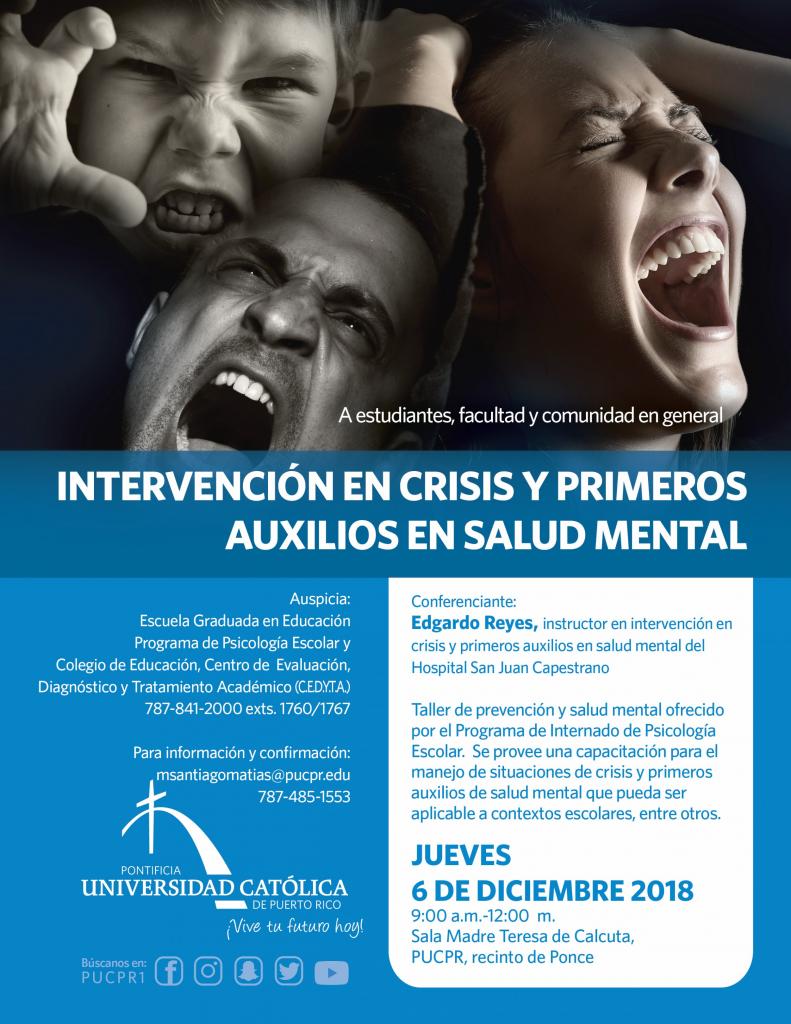 Intervención en crisis y primeros auxilios en salud mental By celimer_torres@pucpr.edu | November 29, 2018 Posted in General ← Balance ecológico y sociedad resiliente¡Histórica hazaña en el voleibol! →