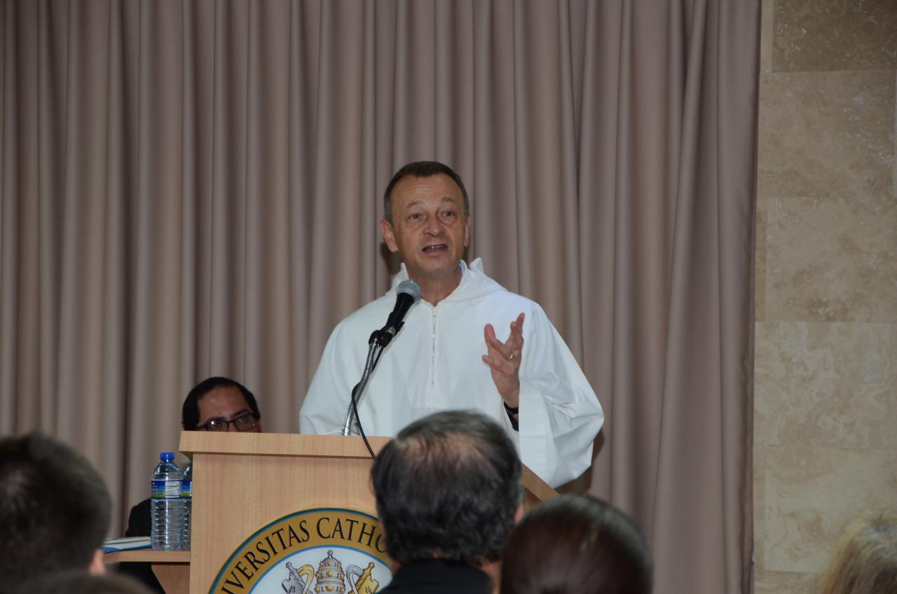 Ante un concurrido público compuesto en su mayoría por estudiantes representantes de todas las escuelas católicas de la región de Ponce y por un gran grupo de estudiantes de la PUCPR, el Hermano Alois Loser ofreció la conferencia Compartir la fe con nuevas generaciones.