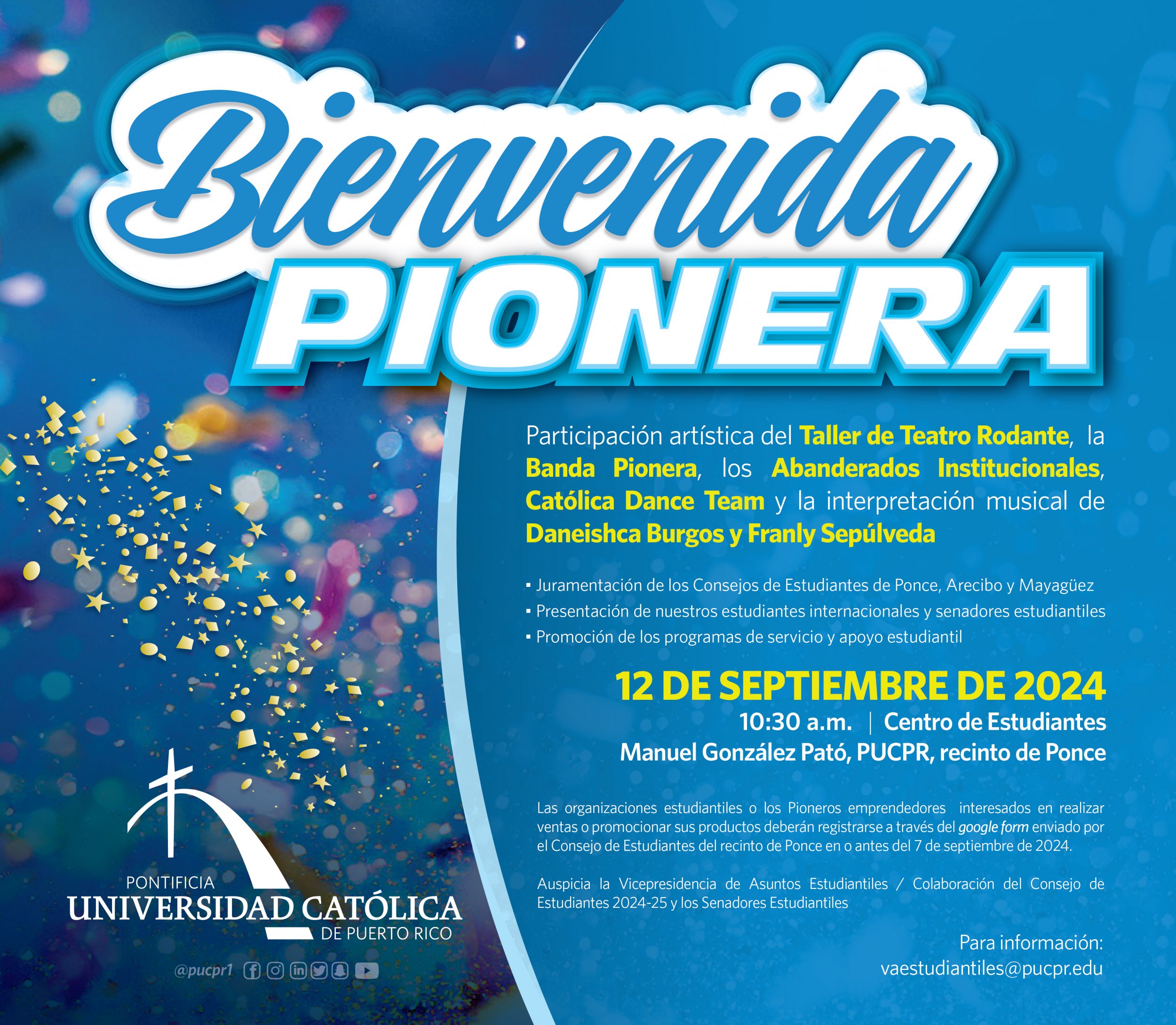 ¡La Bienvenida Pionera te espera! By celimer_torres@pucpr.edu | September 5, 2024 Ven y comparte un buen rato con tus compañeros Posted in General ← Teatreros Pioneros se lucen con un teatro de calle en honor a Victoria Espinosa¿Lo tuyo es el baloncesto? →