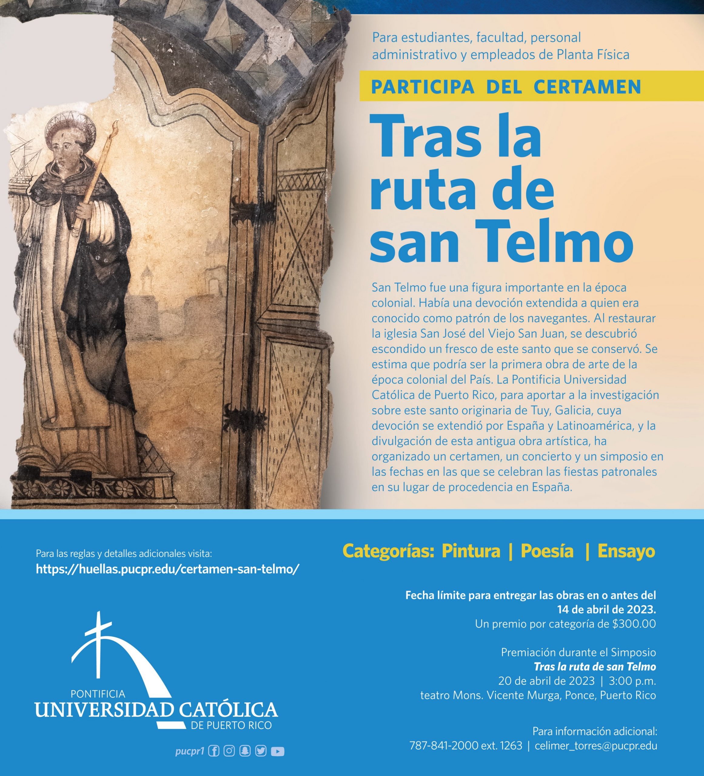 Se abre convocatoria a toda la comunidad universitaria para participar en el Certamen Tras la ruta de san Telmo: Desde Puerto Rico hacia tierras continentales americanas. Hay tres (3) categorías: