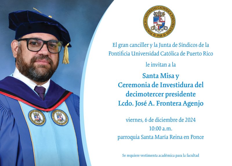 recibirá, de manera oficial, los símbolos institucionales que lo identifican como presidente de la prestigiosa institución académica. El viernes, 6 de diciembre a las 10:00 a. m. se celebrarán la santa misa y la ceremonia de investidura en la parroquia Santa María Reina en Ponce.“Los invito a que me acompañen a la Ceremonia de Investidura como presidente de la Pontificia Universidad Católica de Puerto Rico, una designación que me permite continuar el legado de servicio a nuestro país que siempre ha distinguido a nuestra Universidad”, animó el también catedrático de la Escuela de Derecho de la PUCPR, José Frontera Agenjo.