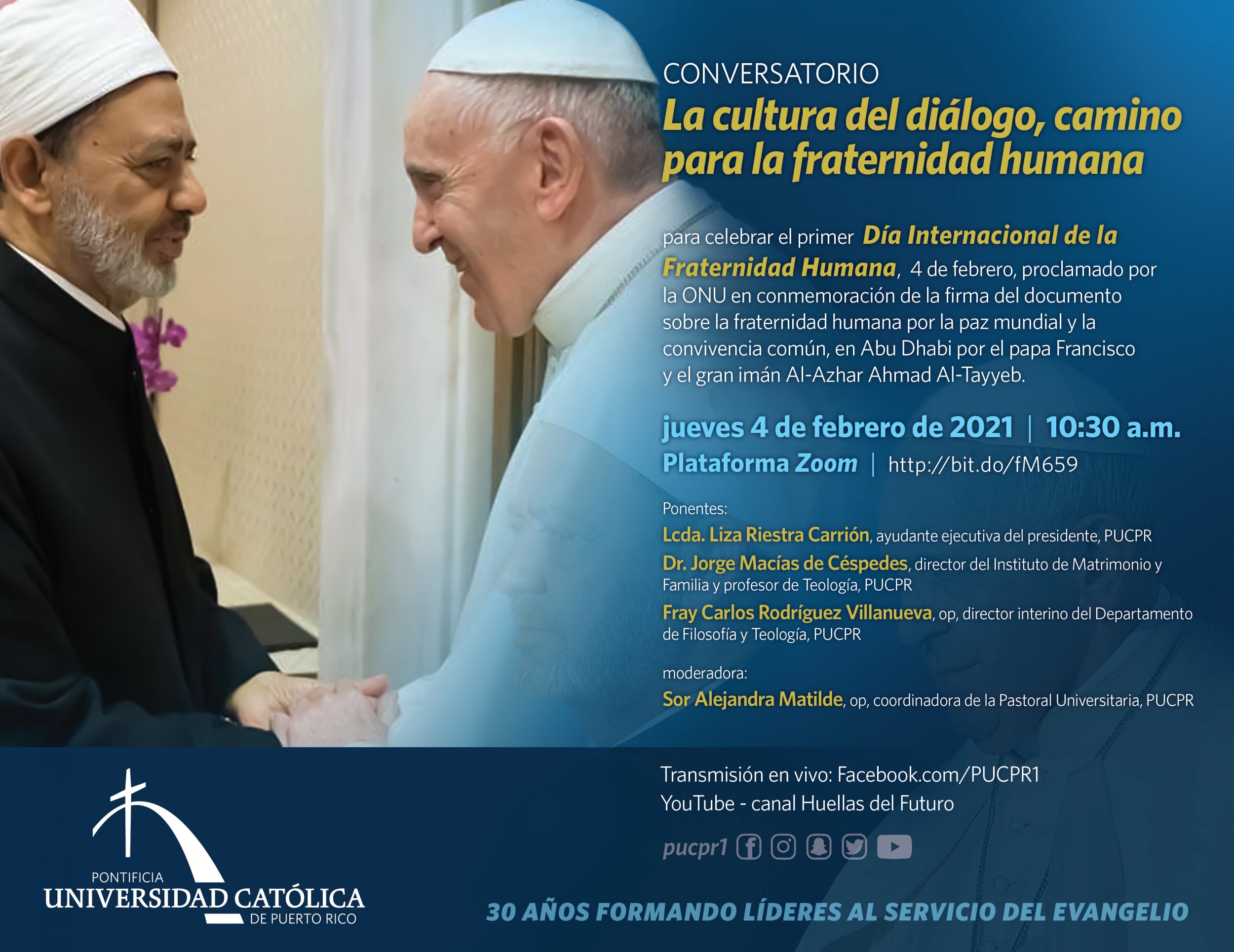 La Católica se une a la celebración del Día Internacional de la Fraternidad Humana By celimer_torres@pucpr.edu | January 28, 2021 El evento conmemora el aniversario de la firma del Documento sobre la hermandad humana por la paz mundial y la convivencia común Posted in General ← ¡Buscamos teatreros!Sublime y musical celebración →