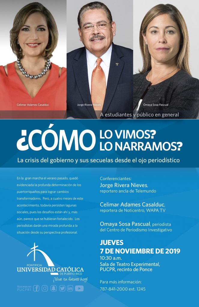La crisis del gobierno y sus secuelas desde el ojo periodístico By celimer_torres@pucpr.edu | October 24, 2019 Reconocidos periodistas presentarán foro en La Católica. Posted in General ← Jueza presidenta del Tribunal Supremo se presenta ante los estudiantes de Derecho¡Líderes en la inclusión! →