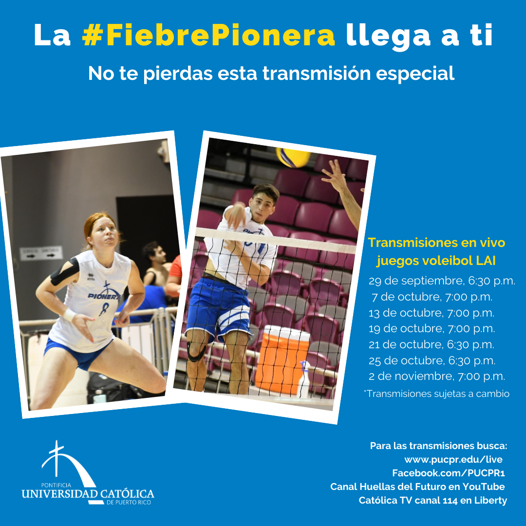 ¡La #FiebrePionera llega a ti! By celimer_torres@pucpr.edu | September 30, 2021 No te pierdas las transmisiones especiales de los partidos del voleibol de la LAI. Revive los encuentros de los Pioneros Posted in General ← La dignidad humana y sus antónimosProblema serio la violencia policial →