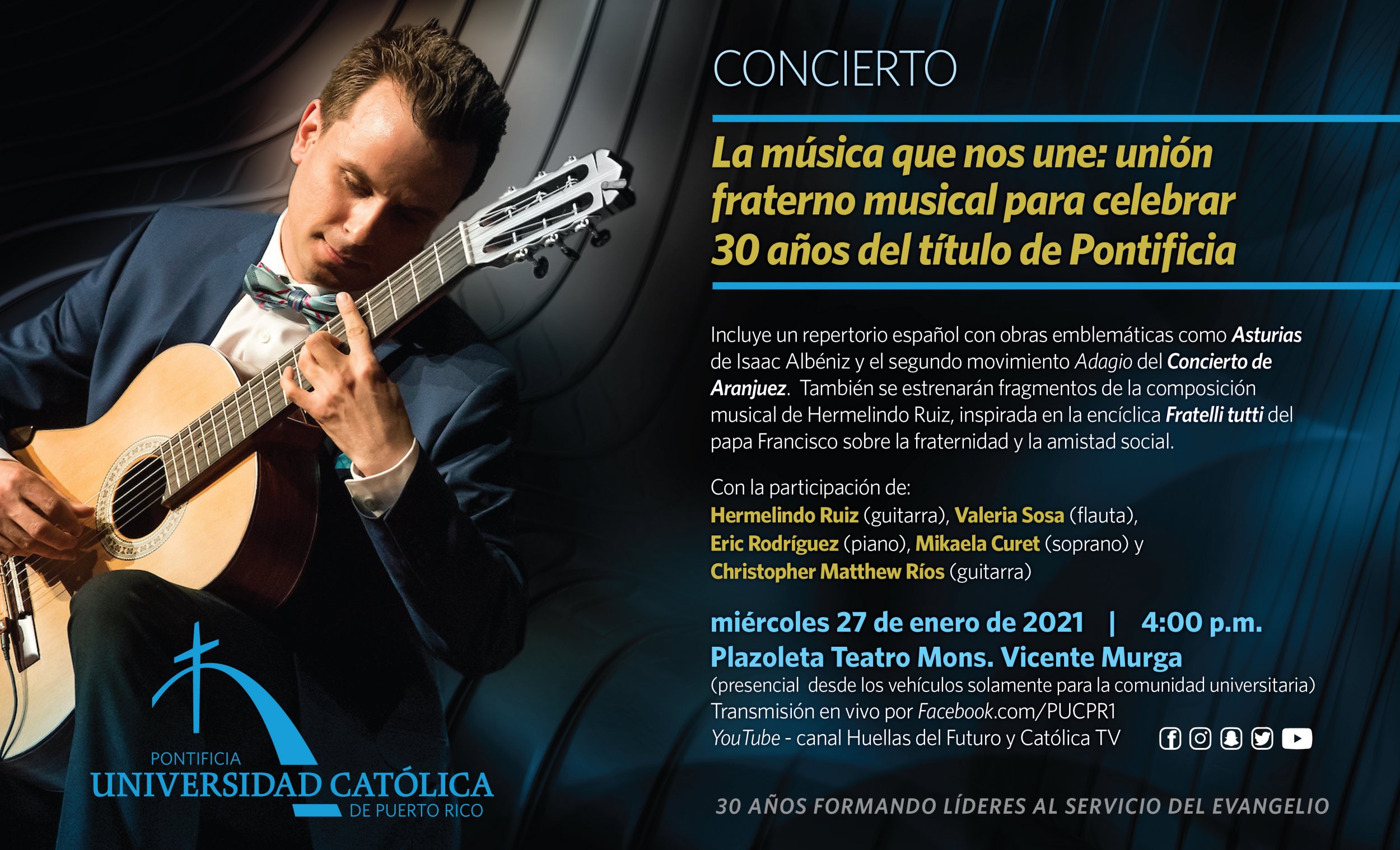 La música que nos une: unión fraterno musical para celebrar 30 años del título de Pontificia By celimer_torres@pucpr.edu | January 21, 2021 En el evento se estrenará un fragmento de la obra musical Fratelli tutti de Hermelindo Ruiz. Posted in General ← Concierto Todos somos hermanos…en el 30 aniversario del título de Pontificia“¡Alégrate Pionero!” →