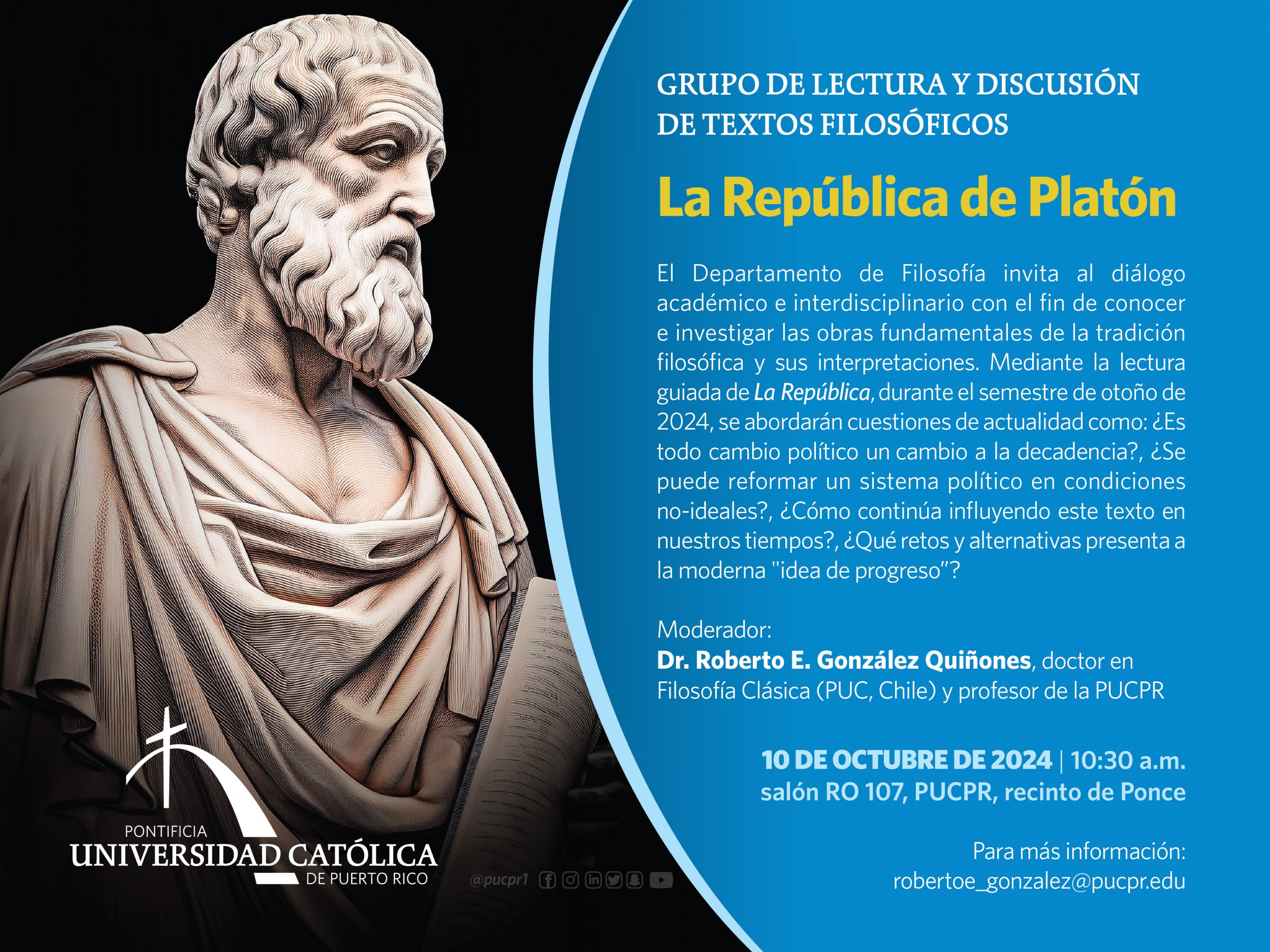 La República de Platón By celimer_torres@pucpr.edu | October 3, 2024 Dialogo sobre las obras fundamentales de la tradición filosófica Posted in General ← Bienvenida teatralCine Pasaje →