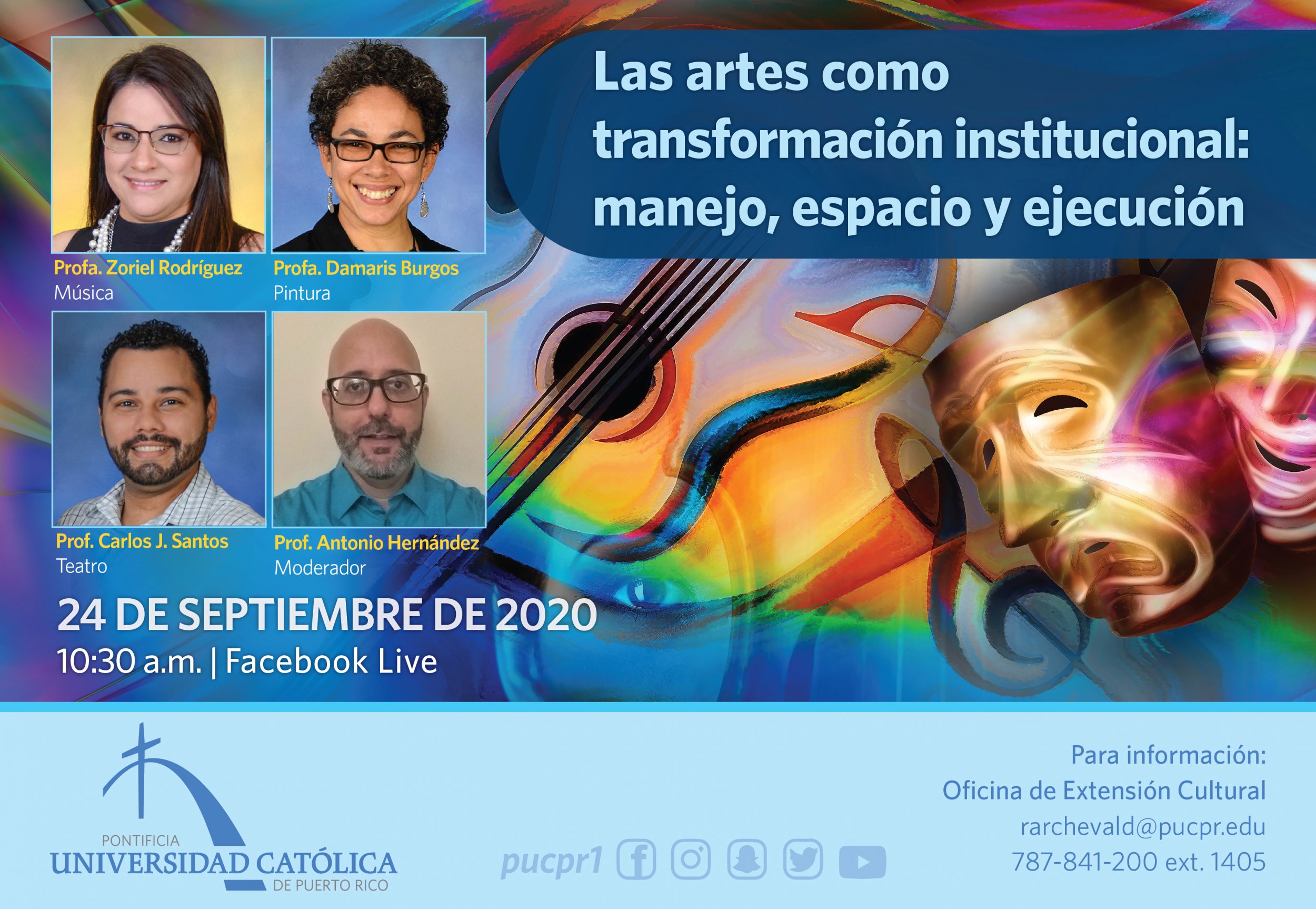 Las artes como transformación institucional By celimer_torres@pucpr.edu | September 17, 2020 Facultativos participan de conversatorio sobre música, teatro y pintura. Posted in General ← Educación integral: desafíos y retos para el bienestar y plenitud holísticaConocer las necesidades del esposo y la esposa →