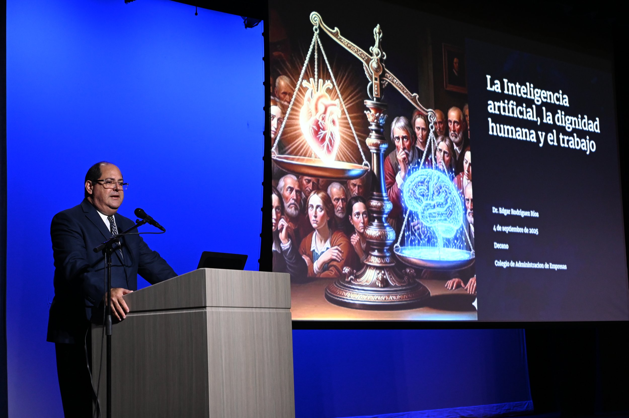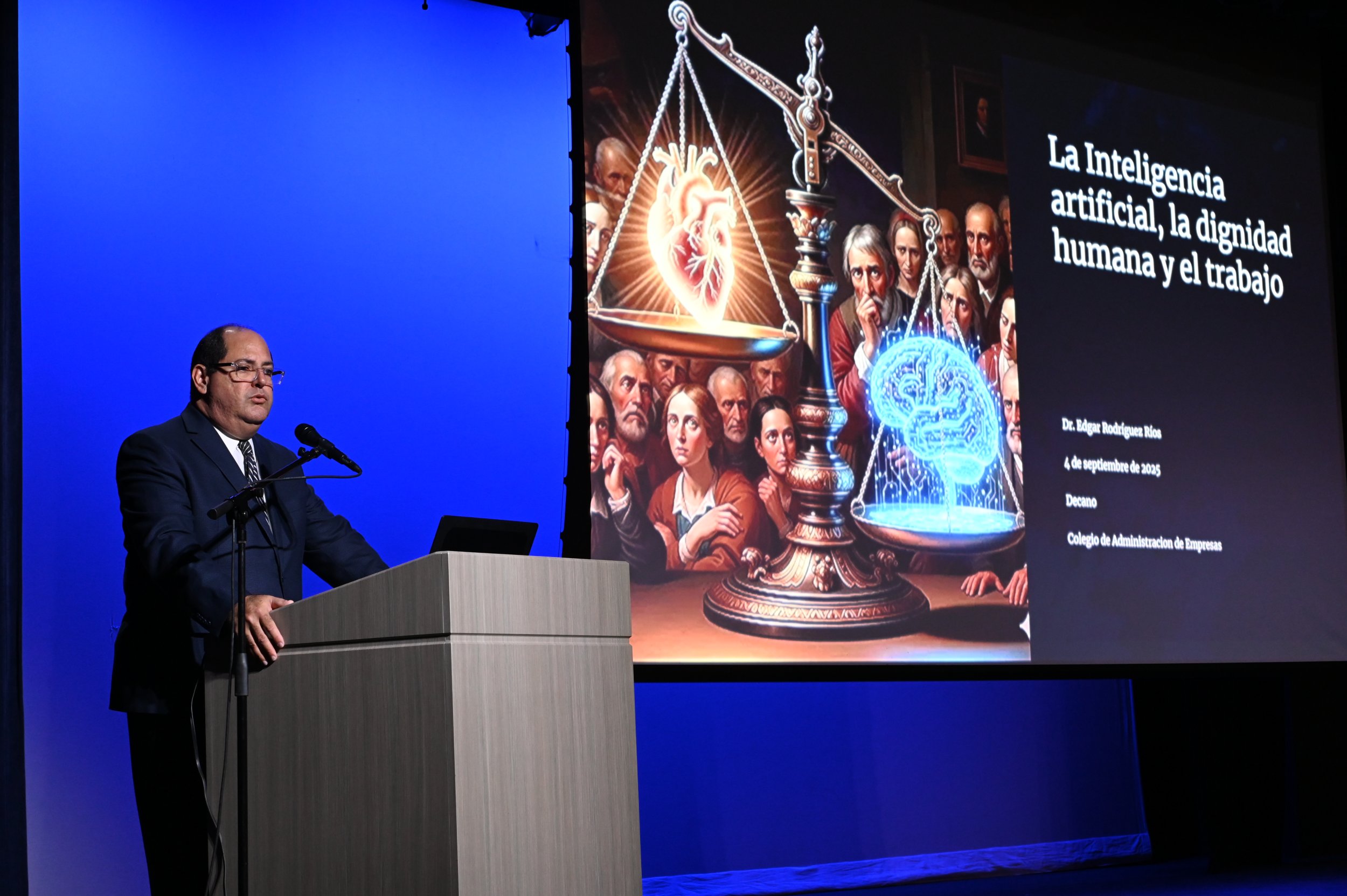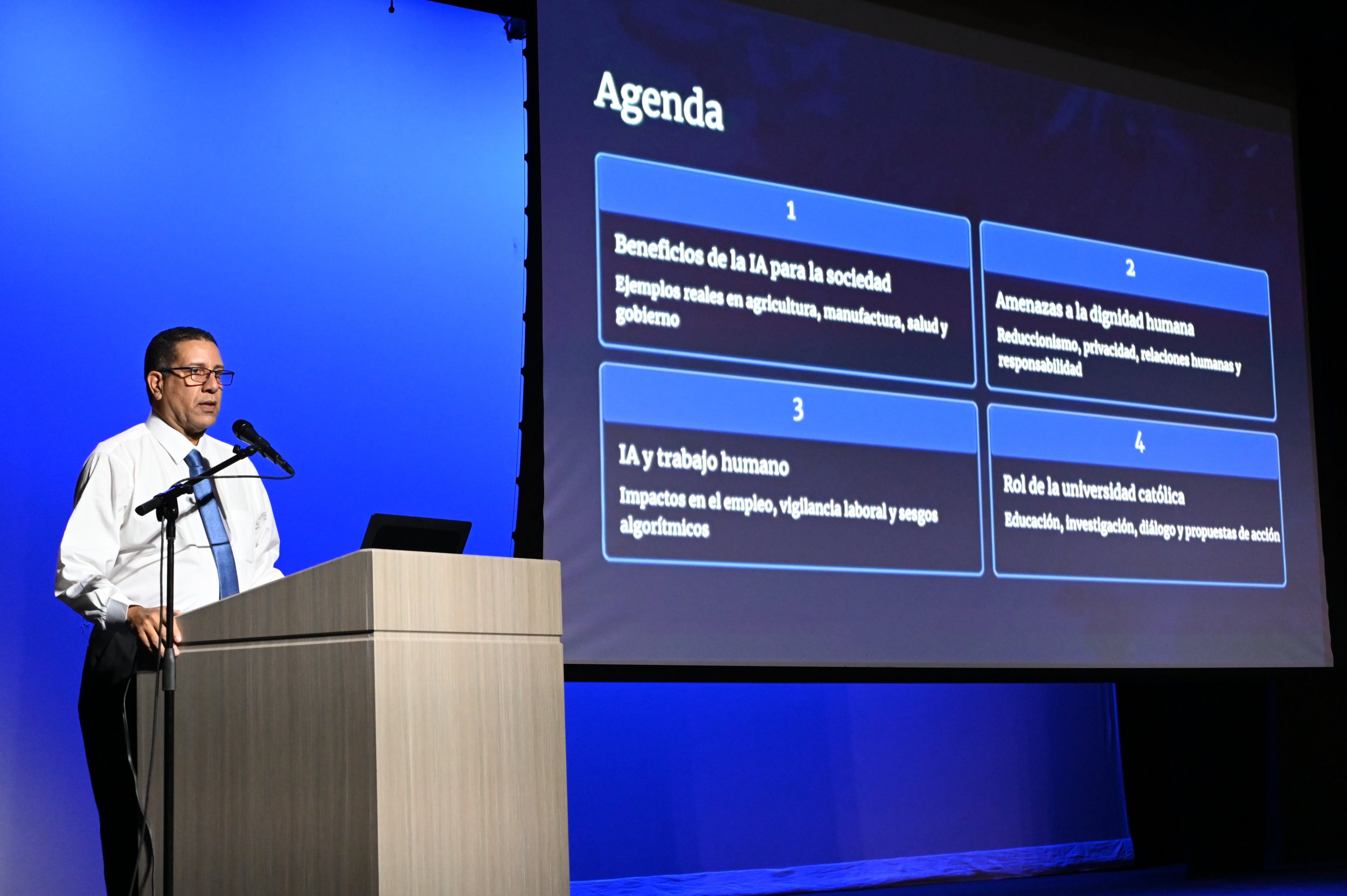 El Lcdo. Israel Santiago, director del Instituto de Doctrina Social de la Iglesia de la PUCPR, expresó que “Nos encontramos en un cambio de época, como bien ha señalado el Papa Francisco. El acelerado avance tecnológico, particularmente en el campo de la Inteligencia Artificial, nos reta a iluminar la realidad con los principios de la Doctrina Social de la Iglesia para proteger la dignidad del ser humano y del trabajo”.