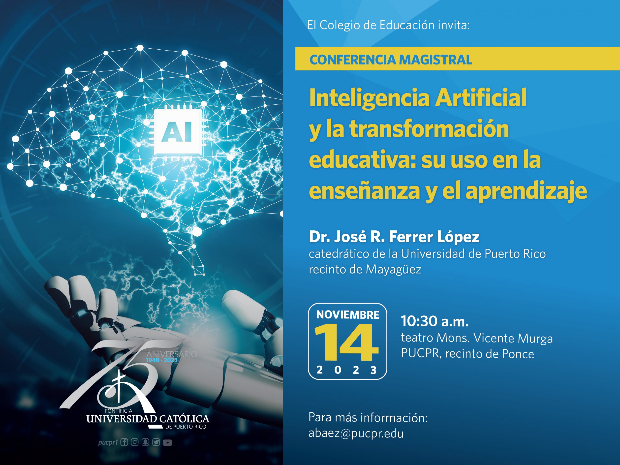 Conferencia Magistral: Inteligencia Artificial y la transformación educativa: su uso en la enseñanza y el aprendizaje By celimer_torres@pucpr.edu | November 2, 2023 El evento es presentado por el Colegio de Educación Posted in General ← Conversatorio ¿Que tal los cuidamos? Violencia contra la niñez y los ancianos¿Eres profesional de la salud o cuidador de un adulto mayor? →