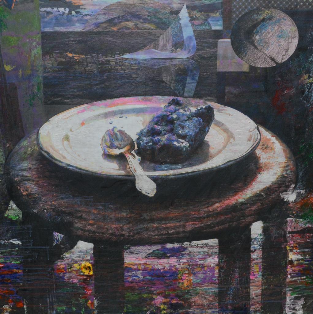 este evento. Mi anhelo es que se celebre esta exposición por muchas décadas más”. Su obra se titula “La isla del Mantengo” y es un mixto- acrílico sobre lienzo. Según el artista explicó los elementos usados en su obra que son un plato, una cuchara y el pan son simbolismos que representan el título de la pieza. El artista ha expuesto en diversos lugares del mundo.