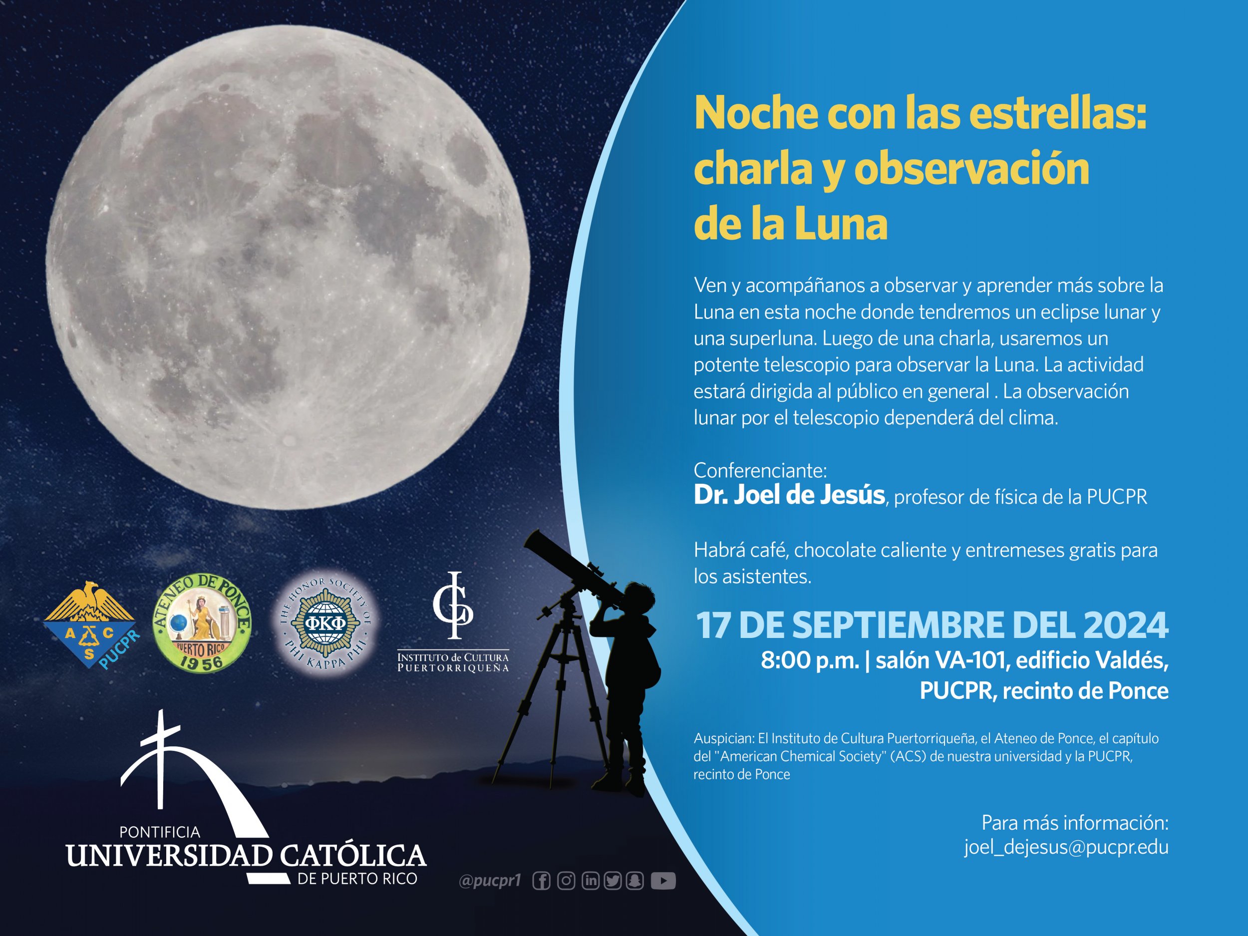Noche con las estrellas By celimer_torres@pucpr.edu | September 11, 2024 ¡Ven y participa de la charla y observación de la Luna! Posted in General ← Barranquilla es moda¿Interesado en una carrera en el campo de la salud? →