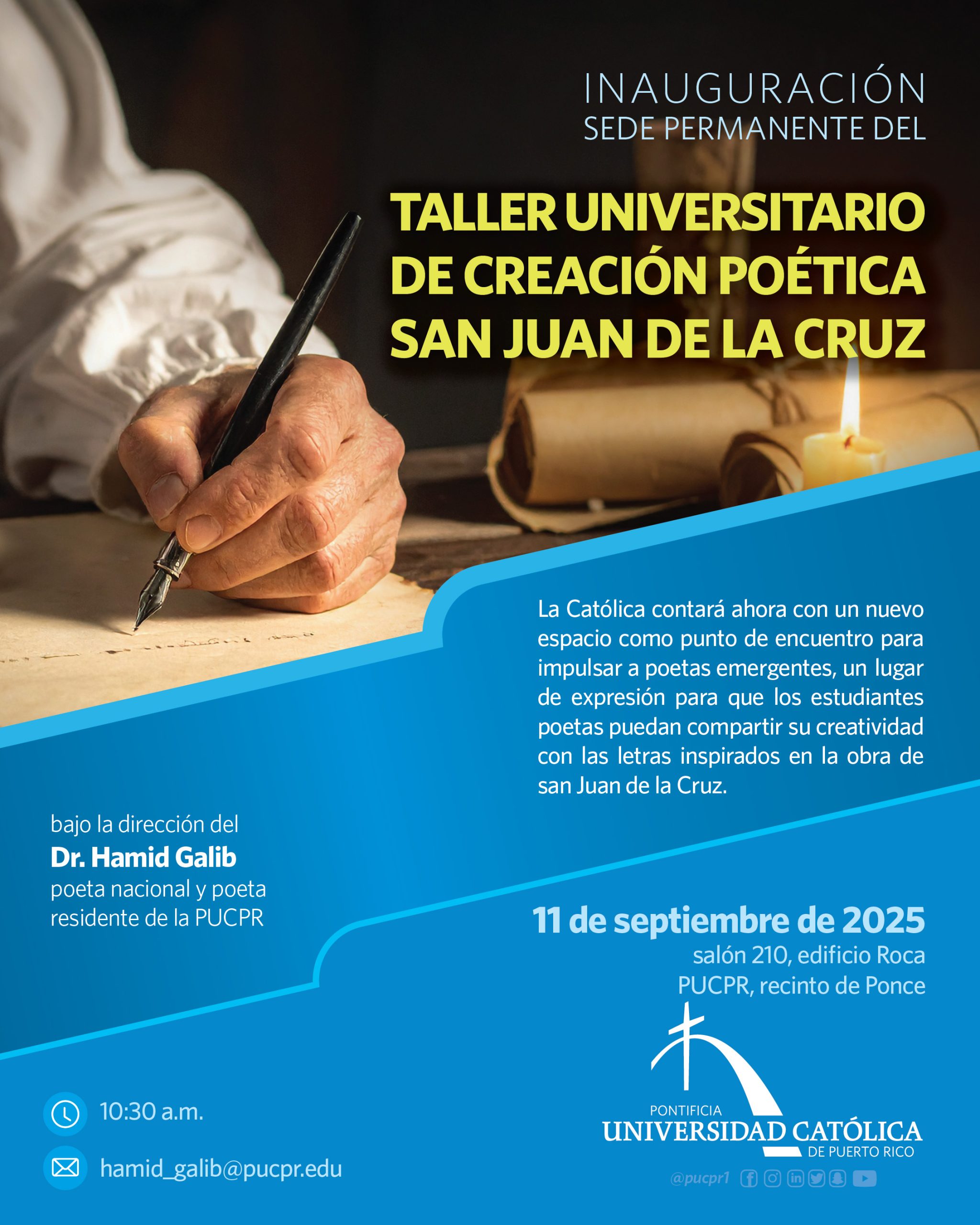 Nuevo espacio para los poetas emergentes By celimer_torres@pucpr.edu | September 5, 2025 Bajo la dirección del Dr. Hamid Galib, la sede permanente se convertirá en un lugar de encuentro de expresión y creatividad Posted in General ← Arrancamos el semestre a lo grande“Escuela de Derecho de la Pontificia Universidad Católica de Puerto Rico presenta Amicus Curiae en defensa de los derechos de menores en procesos judiciales” →