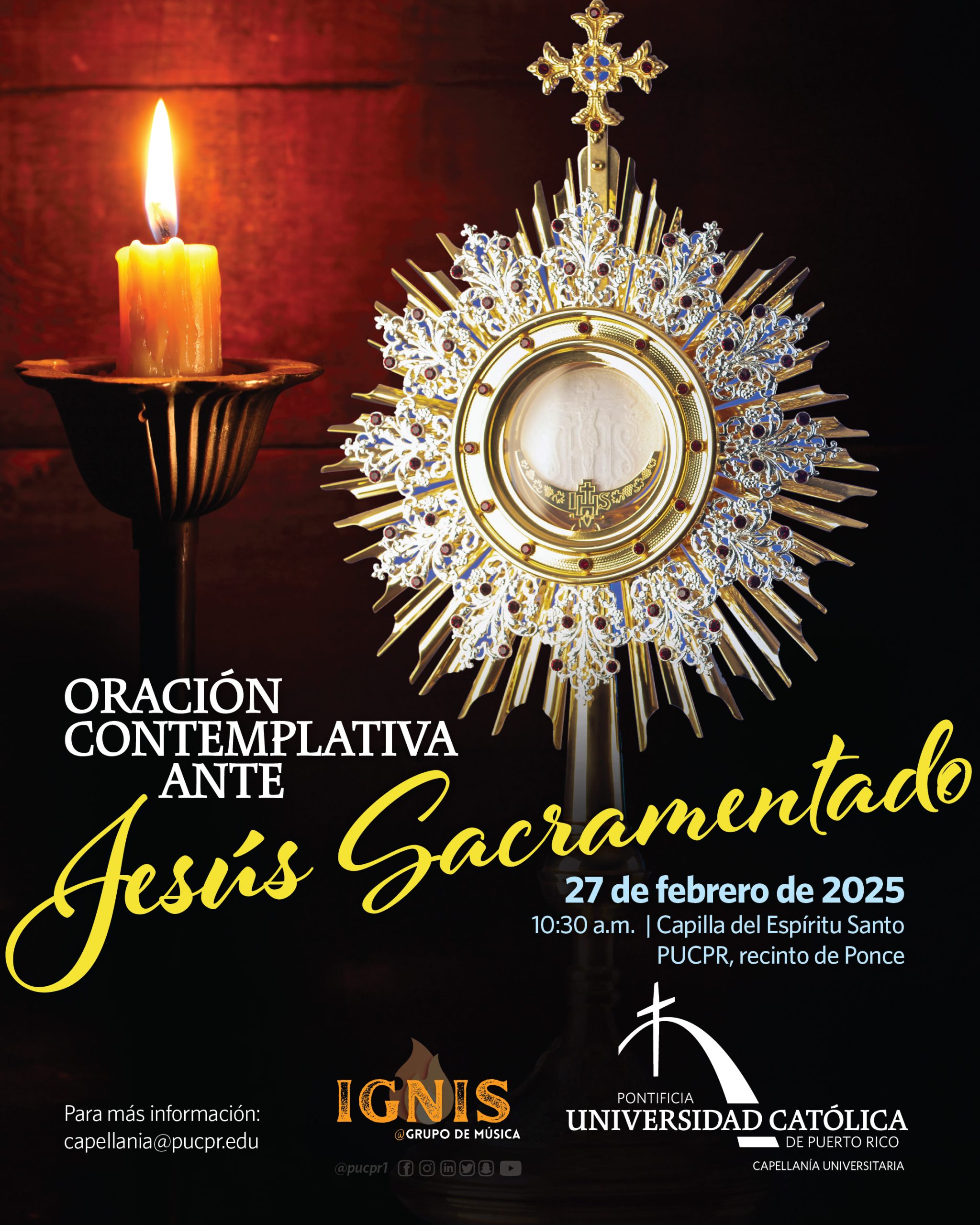 Oración contemplativa ante Jesús Sacramentado By celimer_torres@pucpr.edu | February 21, 2025 Capellanía invita a formar parte de este encuentro con nuestro Señor Posted in General ← La vellonera vitriólica: una máquina del tiempoSimposio internacional de métodos alternos →