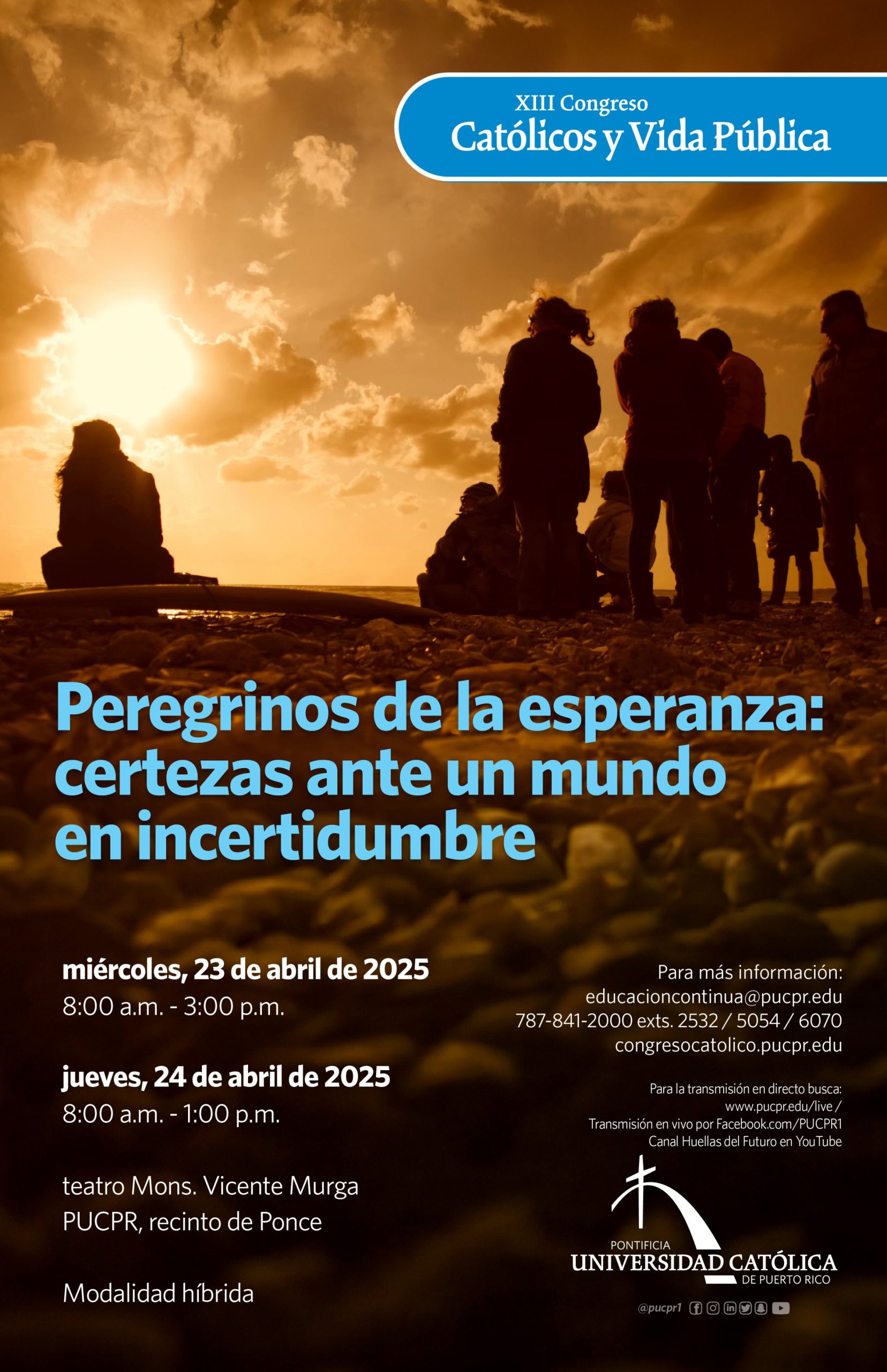 Peregrinos de la esperanza: certezas ante un mundo de incertidumbre By celimer_torres@pucpr.edu | April 10, 2025 La Católica presenta el XIII Congreso Católicos y Vida Pública Registro al XIII Congreso Católicos y Vida Pública Posted in General ← Reconocimiento al compromiso y a la excelencia académica¡Atención, amantes de la música! →