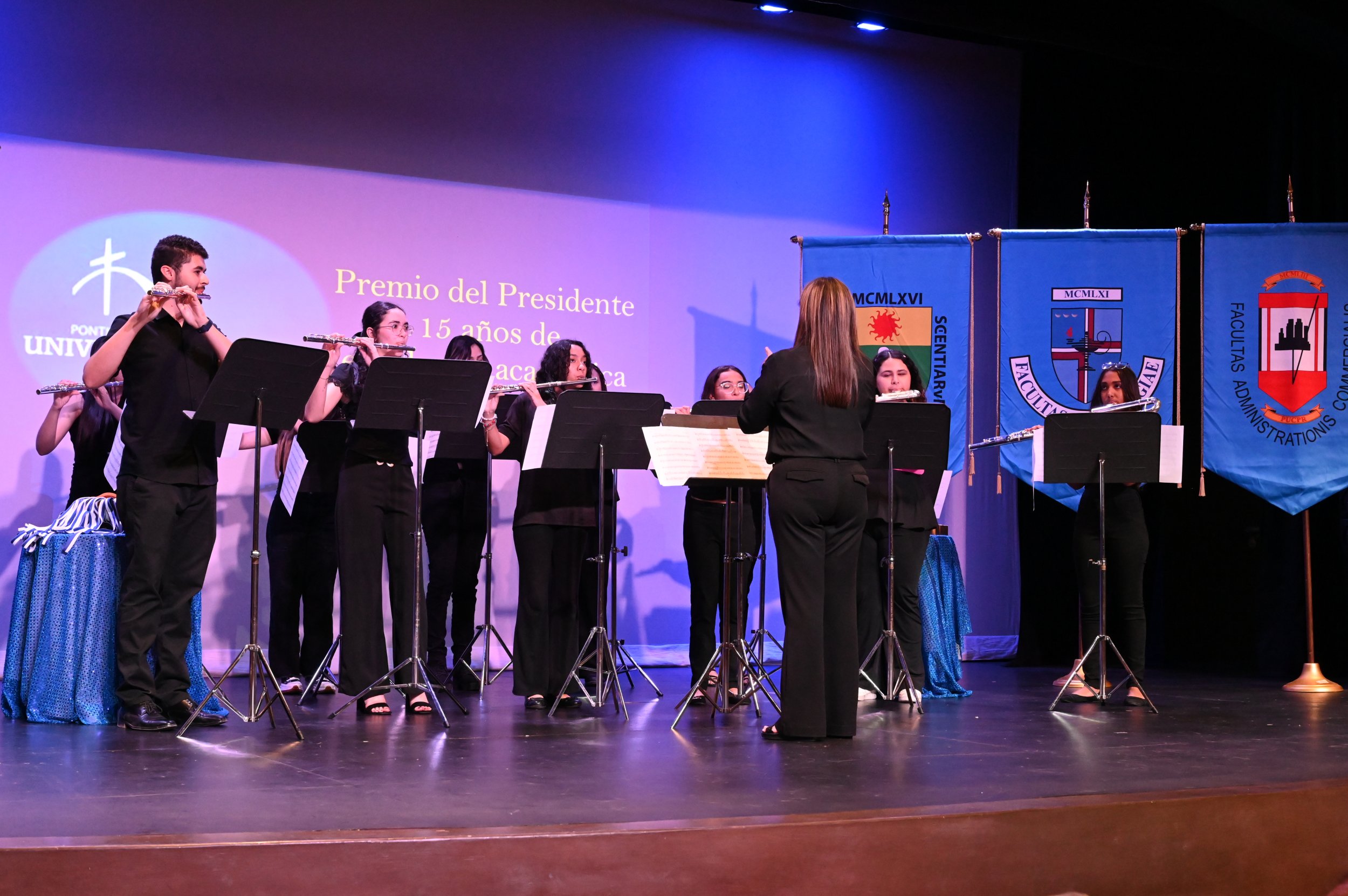 La actividad incluyó la participación del Conjunto de Flautas de la PUCPR, dirigido por la Prof.ª Marinés Avilés, quienes interpretaron las piezas Tango y The Prayer.