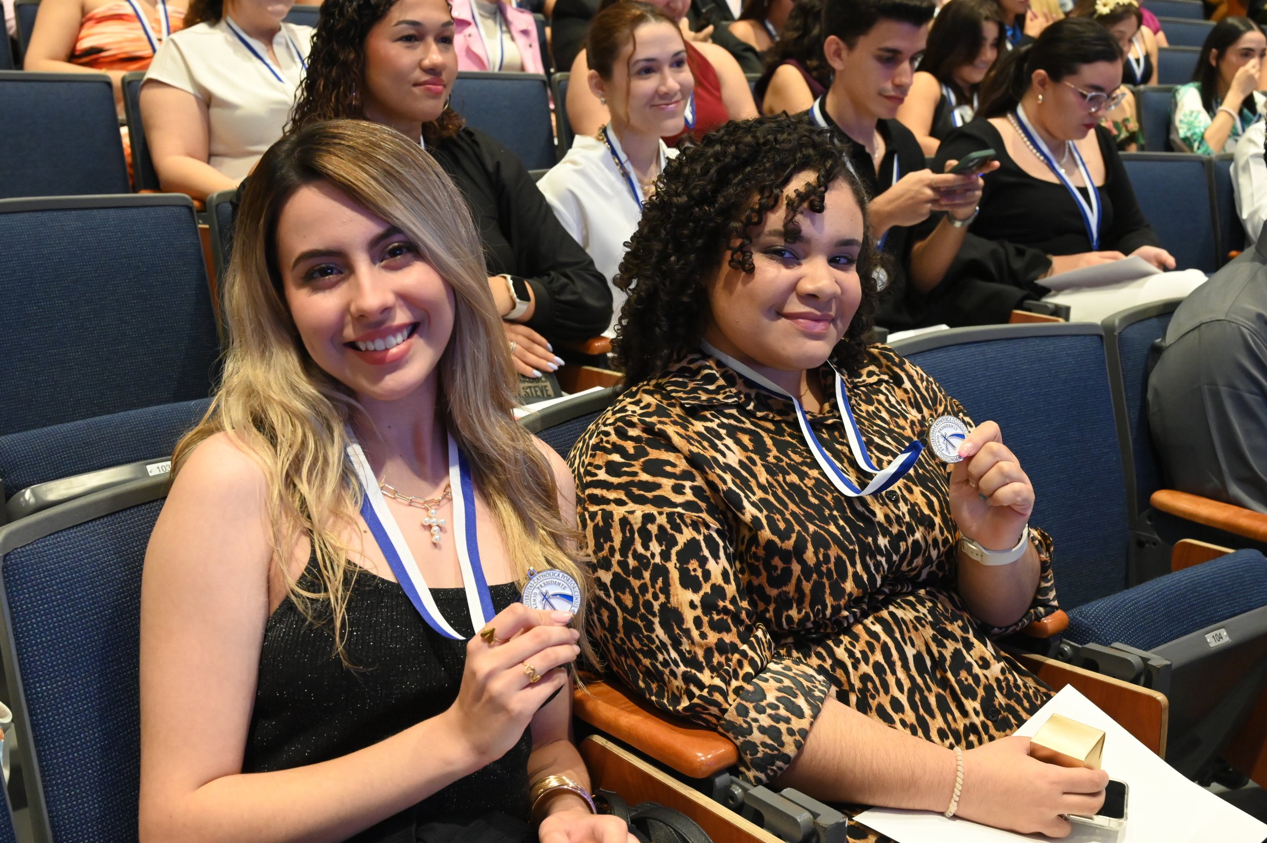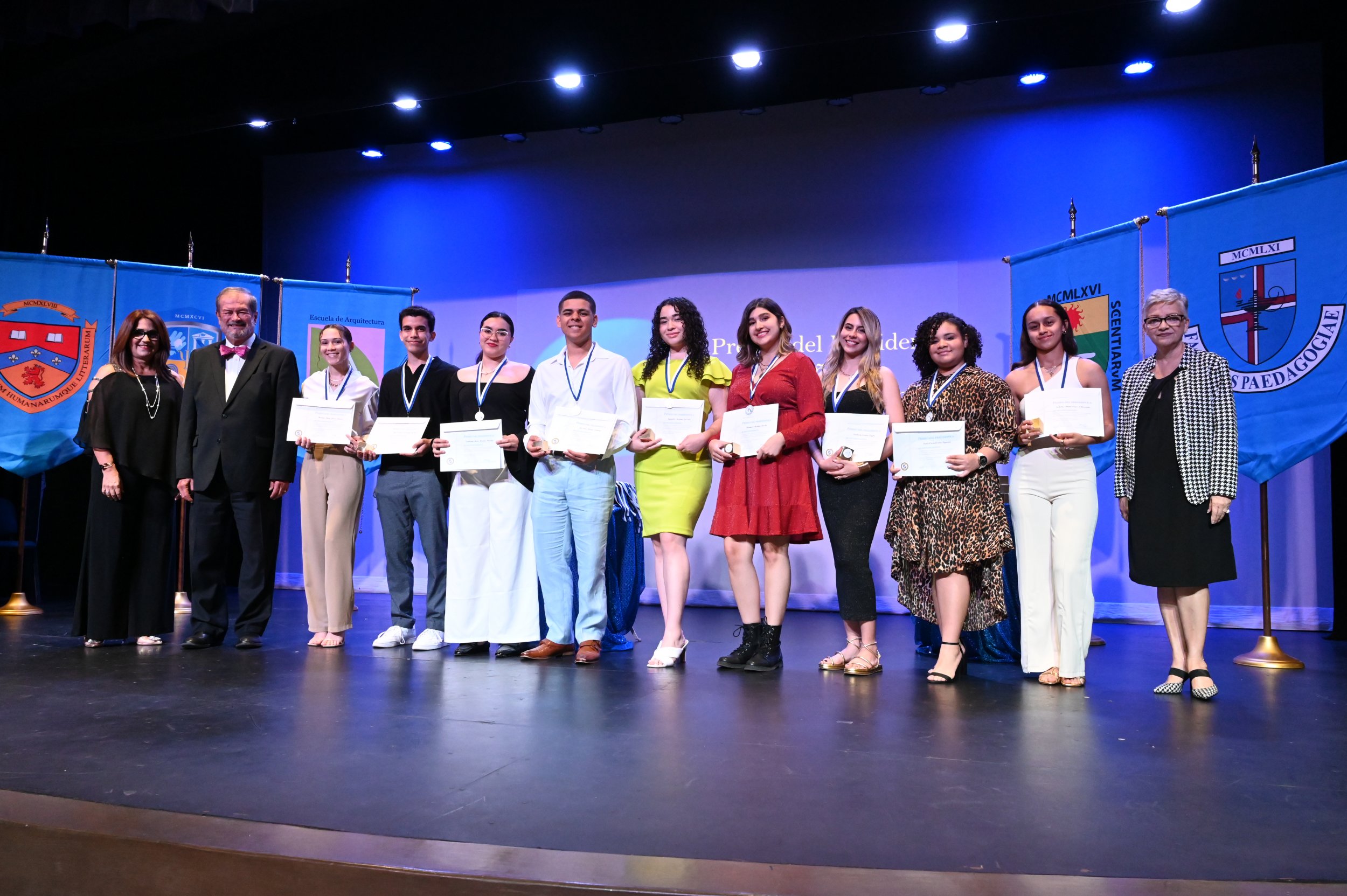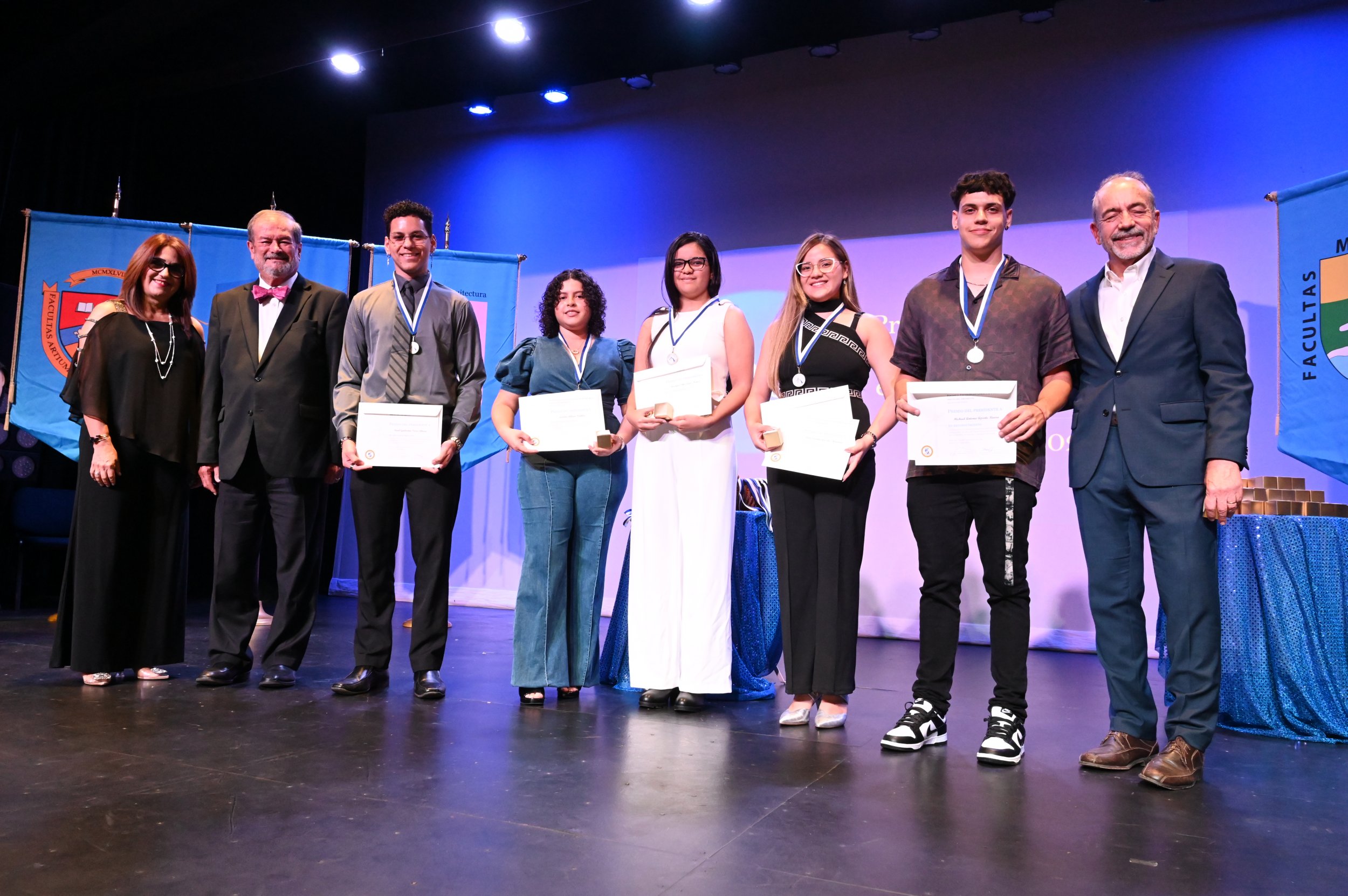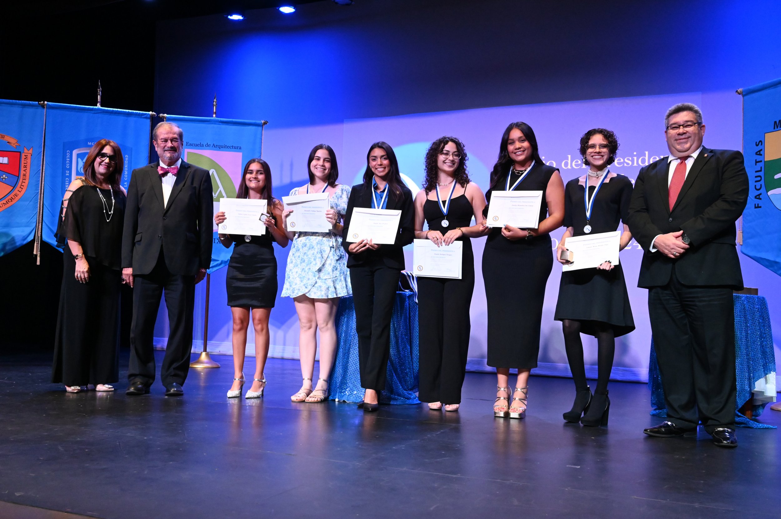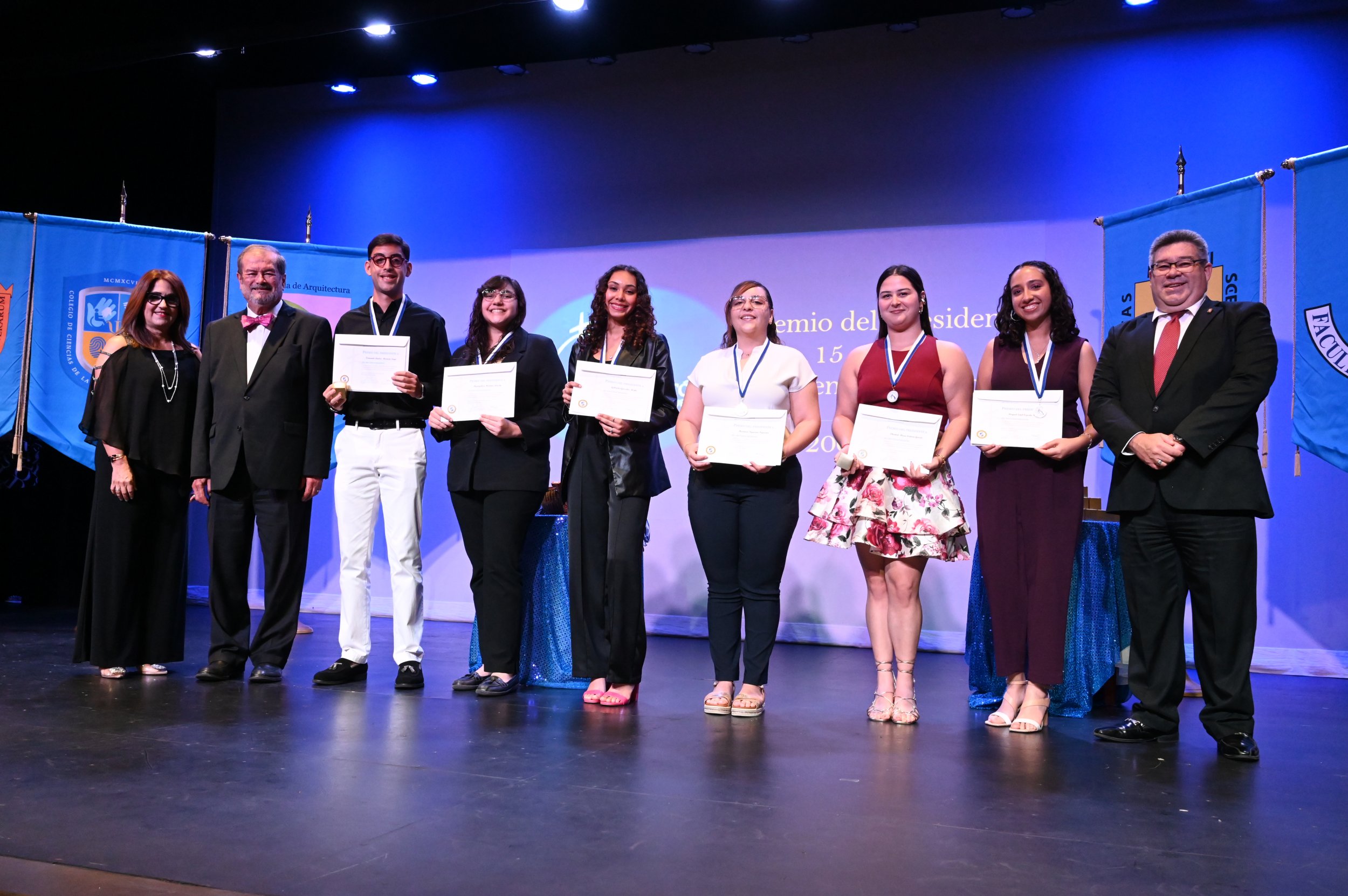 En una emotiva ceremonia realizada en el teatro Mons. Vicente Murga, el Dr. Jorge Iván Vélez Arocho, presidente de la Universidad, junto a la Dra. Myriam D. López, vicepresidenta de Asuntos Estudiantiles, hizo entrega del premio.