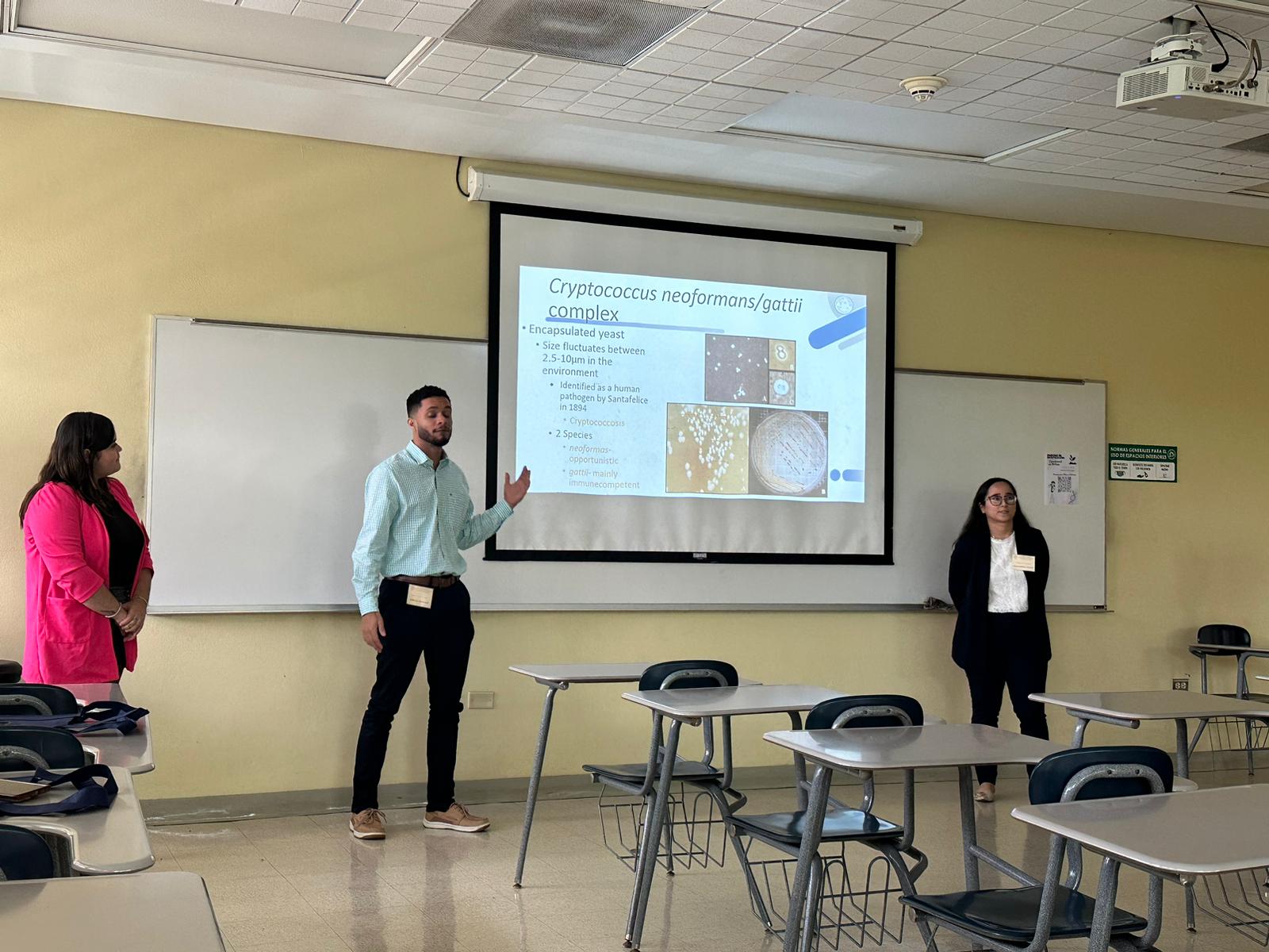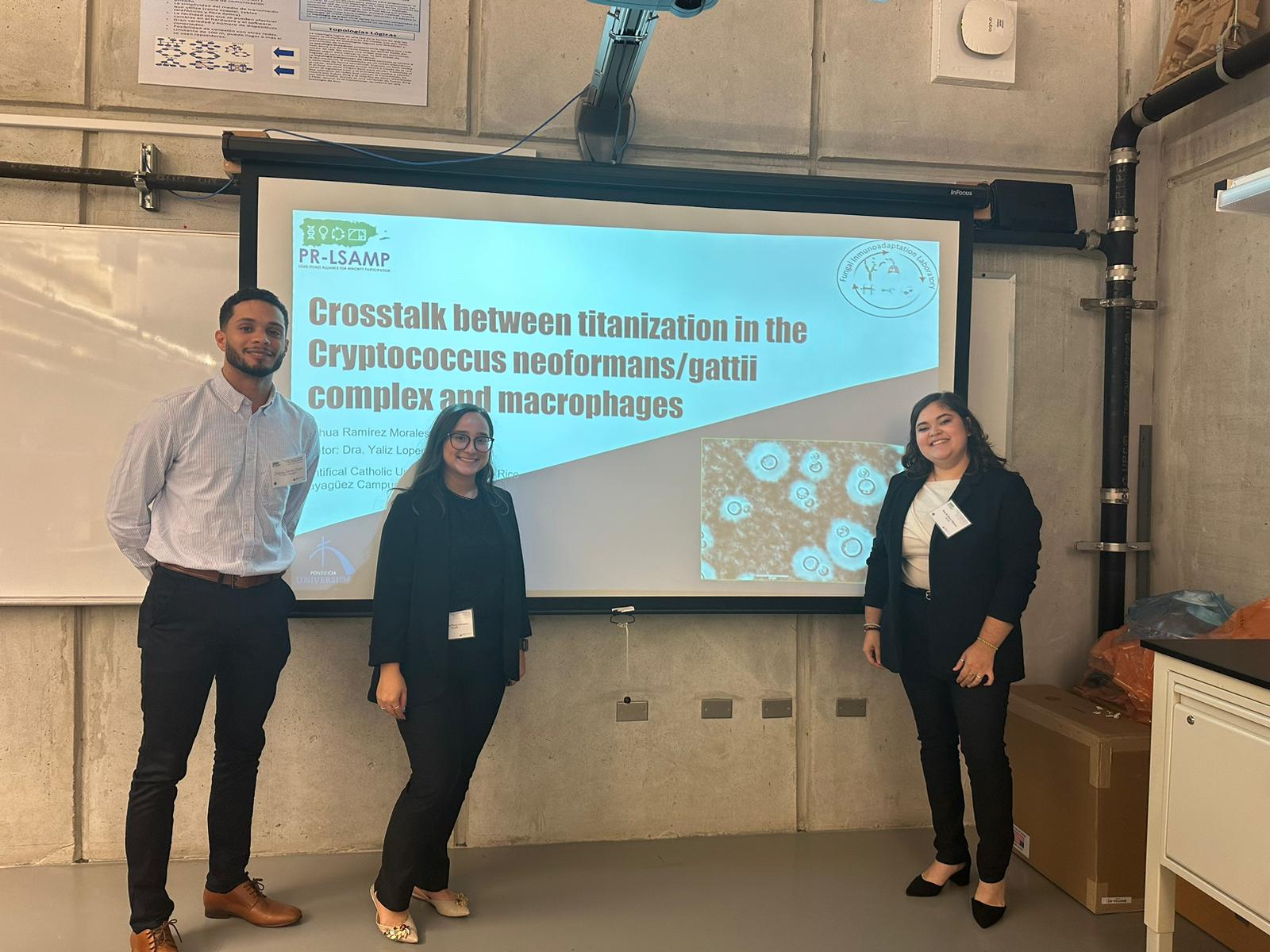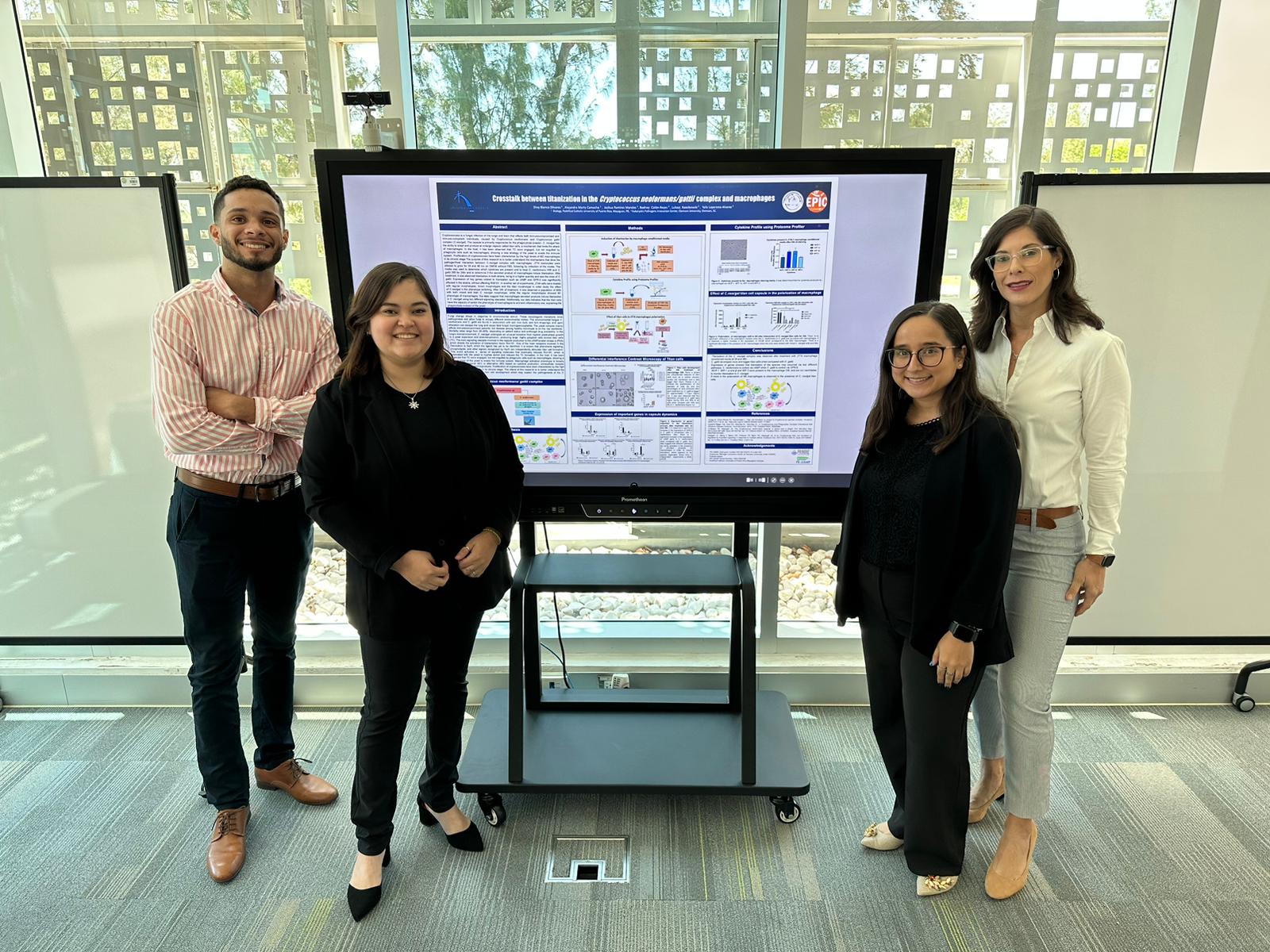 Los estudiantes de investigación de la Dra. Yaliz Loperena tuvieron la oportunidad de presentar sus trabajos relacionados con el proyecto Crosstalk Between Cryptococcus Neoformans/gattii and Macrophages in the Development of Titan Cells. “Los estudiantes comenzaron sus exposiciones en el simposio de investigación de la PUCPR, luego expusieron en el 41st Puerto Rico Interdisciplinary Meeting and 56th ACS Junior Technical Meeting, seguido del Simposio de Biología en el Recinto Universitario de Mayagüez y finalizando con el Poster Day auspiciado por la Sociedad Puertorriqueña de Micología. Como mentora de los estudiantes, me siento más que orgullosa de sus trabajos y empeño. Estos son los frutos cuando se imparte conocimiento con pasión. Han logrado salir hacia delante en unos tiempos retantes para los investigadores” afirmó la Dra. Loperena.