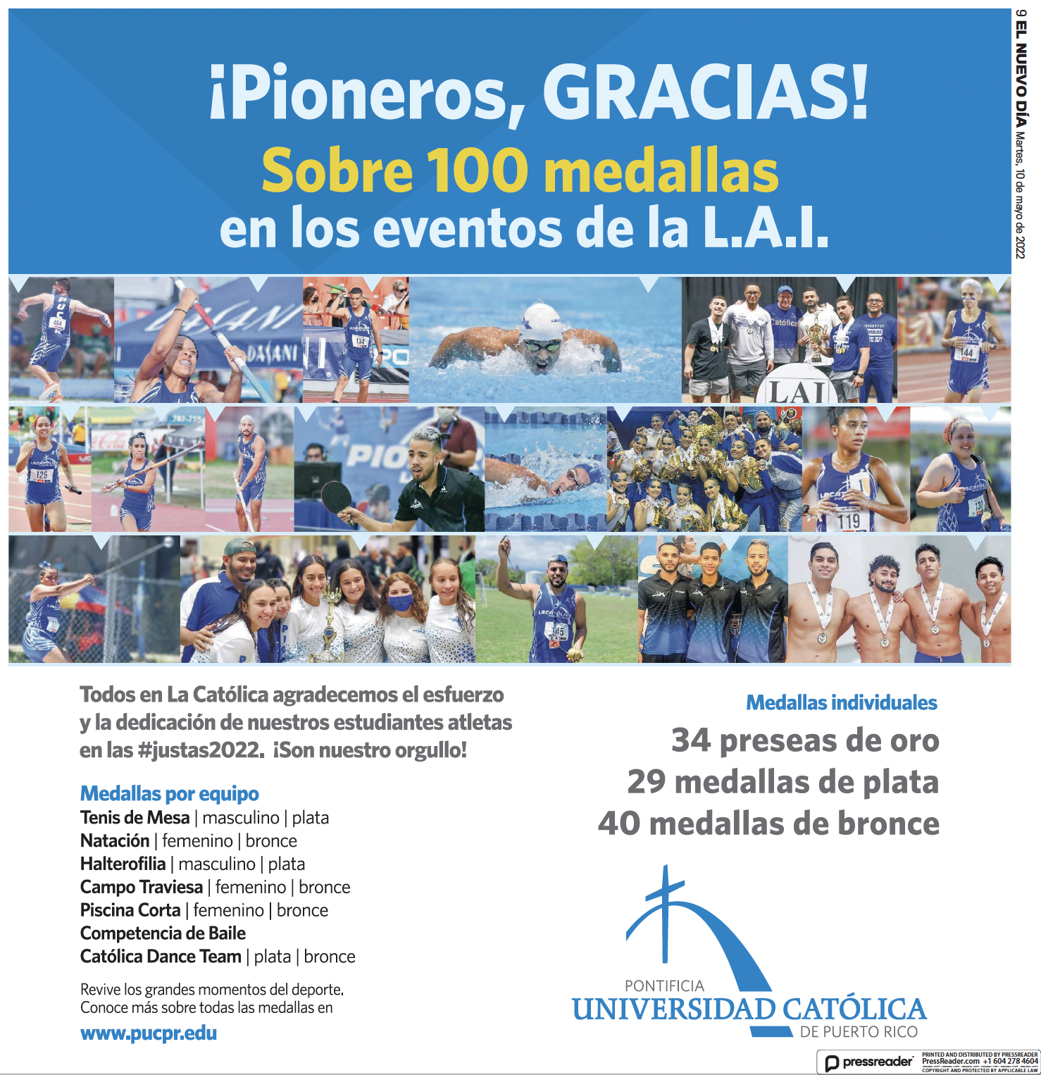 ¡Pioneros, GRACIAS! By celimer_torres@pucpr.edu | May 10, 2022 Sobre 100 medallas en los eventos de la L.A.I. Posted in General ← Sangre Azul al podioArgentina y Puerto Rico →