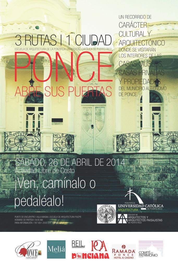 Durante el mes de mayo se celebra en Puerto Rico el mes de la Conservación del Patrimonio Edificado. La Unidad de Preservación y Conservación Adaptativa de la Escuela de Arquitectura de la Pontificia Universidad Católica, se une a la celebración presentando un evento especial titulado Ponce Abre sus Puertas. La actividad consta de recorridos culturales y arquitectónicos en los que se visitarán casas museos, casas privadas y propiedades del Municipio de Ponce. Los asistentes tienen la opción de hacer los recorridos caminando o pedaleando. El evento se llevará a cabo el sábado, 26 de abril a partir de las 9:00 AM y el punto de encuentro será en la sala Aula Magna de la Escuela de Arquitectura.