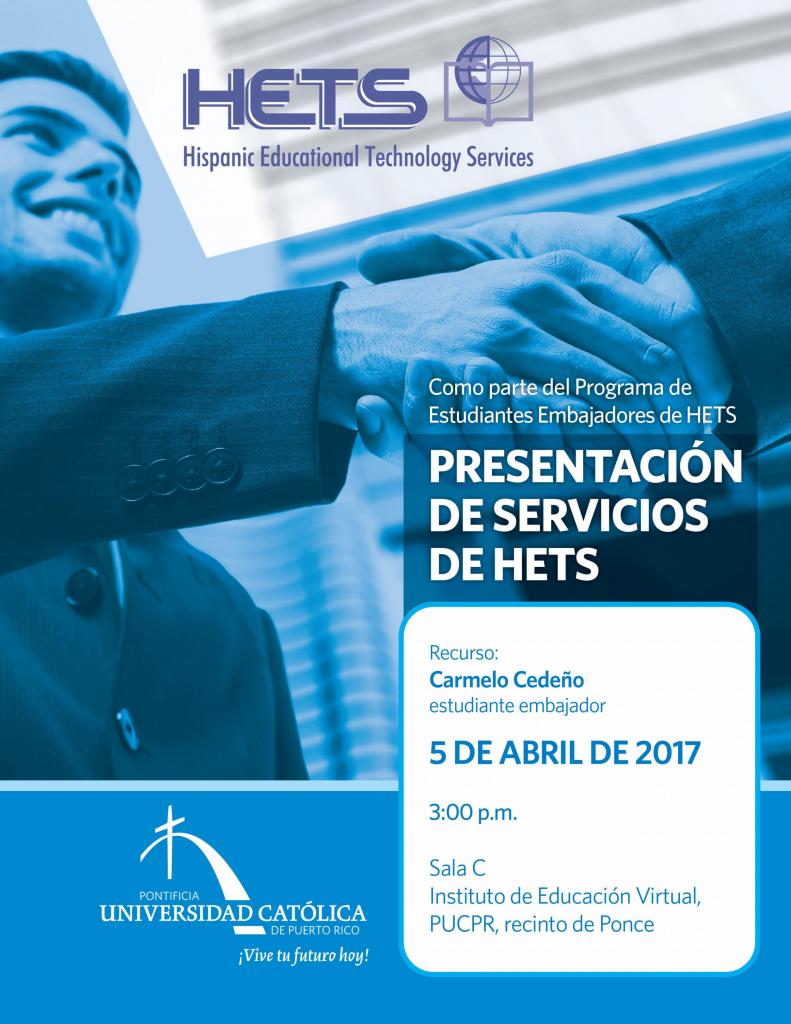 Presentación de Servicios de HETS By celimer_torres@pucpr.edu | March 31, 2017 Posted in General ← ¿Ya estás listo para las Justas LAI 2017?Eres el héroe de tu propia historia →