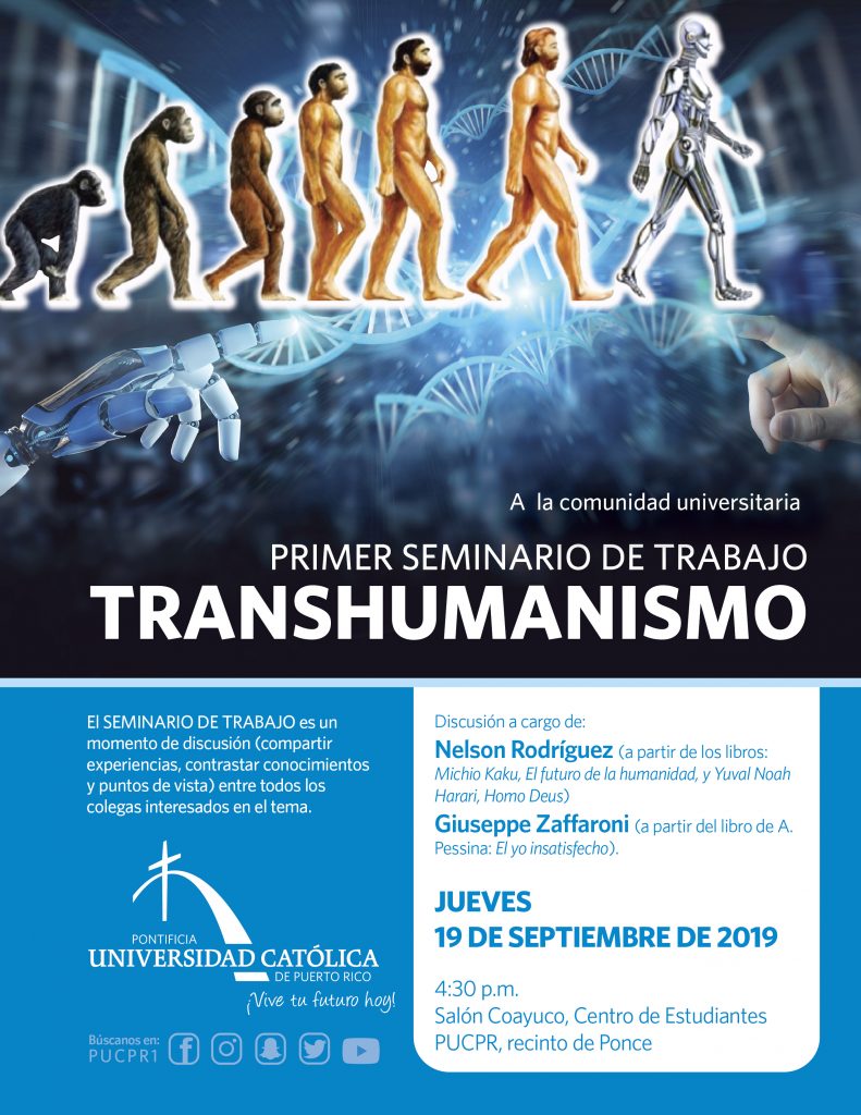Primer seminario de trabajo transhumanismo By celimer_torres@pucpr.edu | September 12, 2019 Expertos analizarán y discutirán el tema Posted in General ← ¡Que me velen para’o!Vivir en familia →