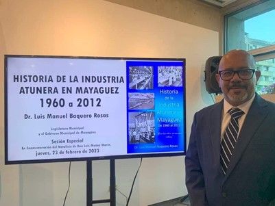 El Dr. Luis Manuel Baquero Rosas, catedrático asociado de Negocios Internacionales y Gerencia dentro del Colegio de Administración de Empresas en los recintos de Mayagüez y Ponce presentó su libro Historias de las atuneras en Mayagüez desde 1960 al 2012. La presentación se dio en una sesión especial de la Legislatura municipal de Mayagüez convocada para conmemorar el 125 aniversario del natalicio de Luis Muñoz Marín, quien gobernó a Puerto Rico durante 16 años (1948-1964).