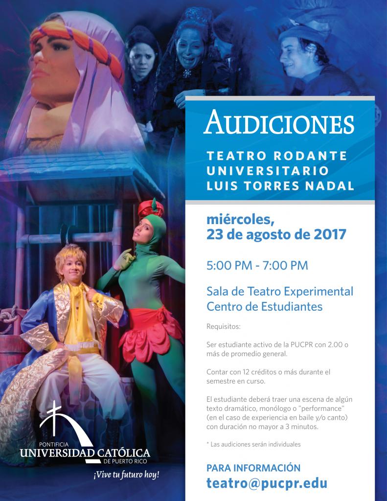 Prueba tu talento en las audiciones para el Teatro Rodante Universitario Luis Torres Nadal By celimer_torres@pucpr.edu | August 3, 2017 Posted in General ← ¡Ponlo en tu agenda!Simposio Internacional sobre Ecología Laudato Si →