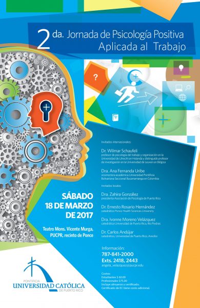 El evento será el sábado 18 de marzo de 2017, en el Teatro Mons. Vicente Murga de la PUCPR. Para registro de la Segunda Jornada de Piscología Positiva Aplicada al Trabajo debe comunicarse con la profesora del programa de Psicología Industrial / Organizacional, Dra. Ángela Velázquez al 787.841.2000, exts. 2418, 2443. También puede escribir a angela_velazquez@pucpr.edu