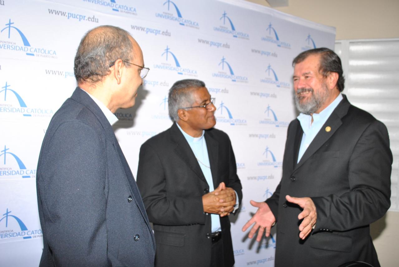 El presidente de la PUCPR, Dr. Jorge Iván Vélez Arocho, junto al Obispo de la Diócesis Fajardo-Humacao y el Padre Adalín Rivera Sáez ofrecieron detalles del programa a los participantes en la Vicaría de Educación de Fajardo.