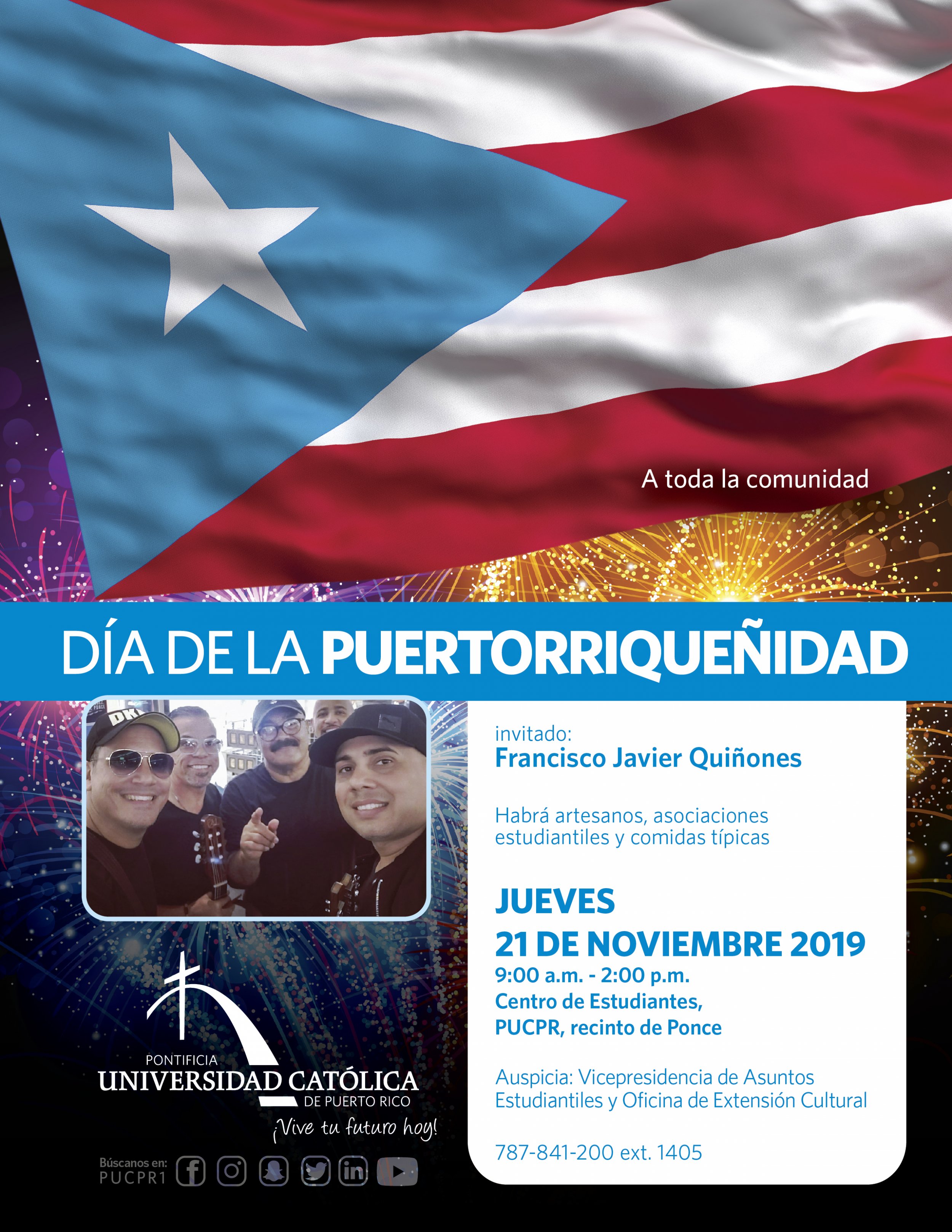 ¡Celebremos la puertorriqueñidad! By celimer_torres@pucpr.edu | November 13, 2019 La Católica celebra día de la puertorriqueñidad. Posted in General ← La Católica celebra décimo aniversario de la Escuela de Arquitectura como motor del país.Contra la tortura de los números →