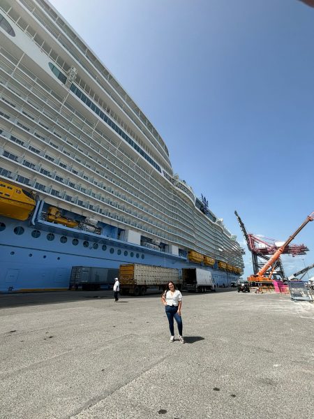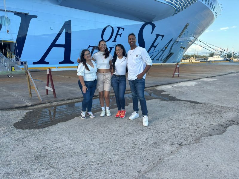 Ante esta oportunidad, los estudiantes Pioneros del Programa de Empresarismo Turístico del Colegio de Administración de Empresas del recinto de Ponce de La Católica no se quedaron con los brazos cruzados. “Aprovecharon y asistieron como voluntarios para recibir y ofrecer asistencia a la tripulación del crucero de la línea Royal Caribbean. A Charielys Rosado se unieron: Geandavi Ortiz, Kettyliann Cruz, Nicole Pérez, Luana Martínez, Alondra González y Lizbeth Sepúlveda. El barco, según la Compañía de Turismo, es gemelo del Icon of the Seas que estuvo en el puerto de Ponce en enero. De la misma manera, la visita de esta embarcación ha sido con propósito administrativo y de preparación para cumplir con las regulaciones federales y así poder comenzar sus viajes oficiales”, sostuvo la profesora de Turismo, Frances Santiago Hernández.