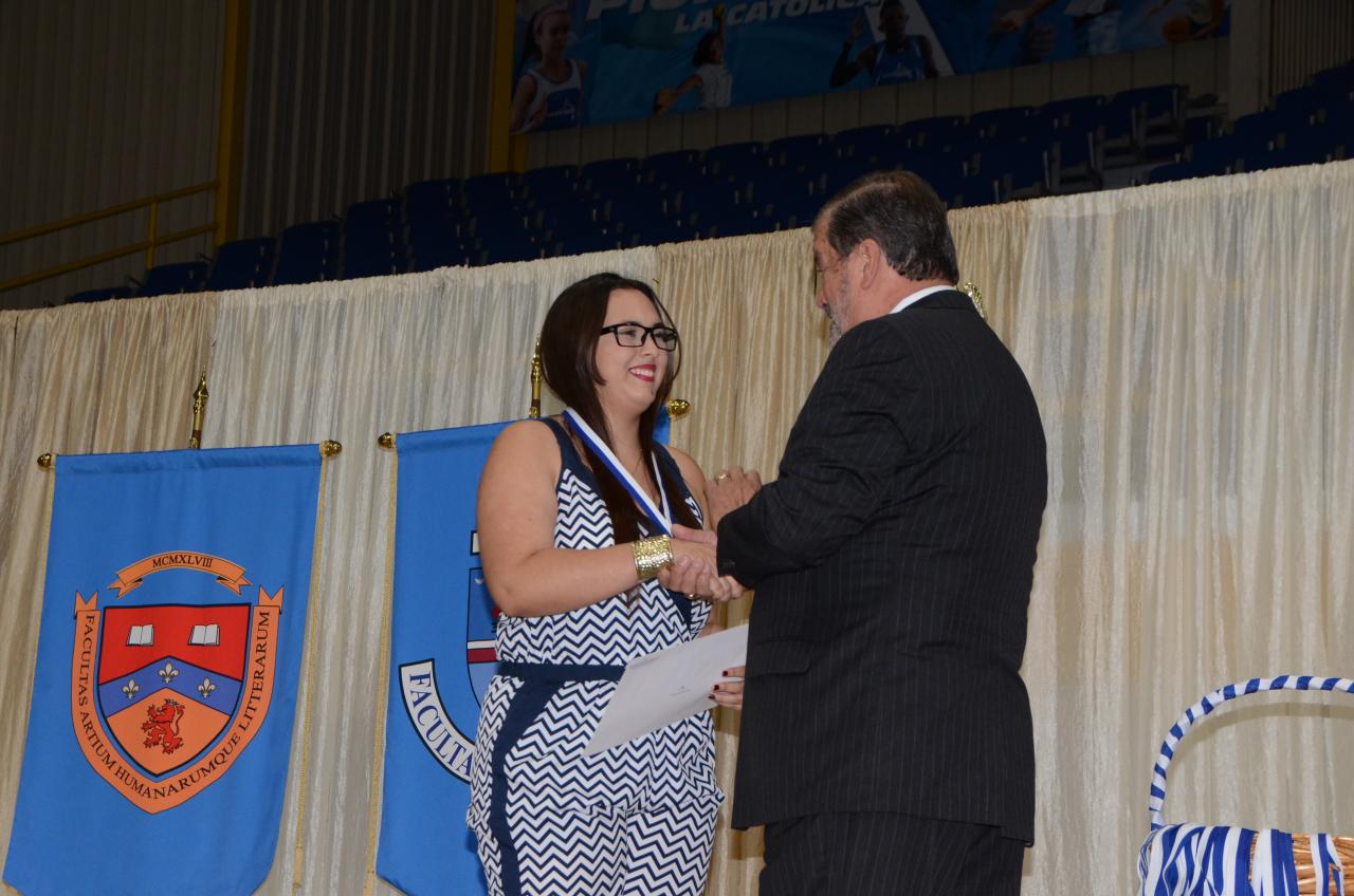 aceptación del premio en nombre de ella y de sus compañeros. La futura arquitecta sostuvo “En los momentos actuales que vive nuestro país, es imprescindible que continúe brillando la luz de la esperanza. Ese es nuestro gran reto, decirle a Puerto Rico aquí estamos, somos jóvenes comprometidos con una auténtica transformación; una transformación que nazca desde adentro y que sea el producto de la determinación, la entrega y del sacrificio. Este es nuestro deber. En las diferentes disciplinas en las que nos hemos formado hemos adquirido herramientas que nos ayudarán a aportar a nuestro país. Para eso nos han preparado y ahora caminaremos formados integralmente para construir un mundo mejor”. La joven agradeció al Presidente por el reconocimiento y expresó “Gracias por reconocer nuestro esfuerzo, por hacernos sentir parte de esta, la mejor Universidad, la Pontificia Universidad Católica de Puerto Rico”.
