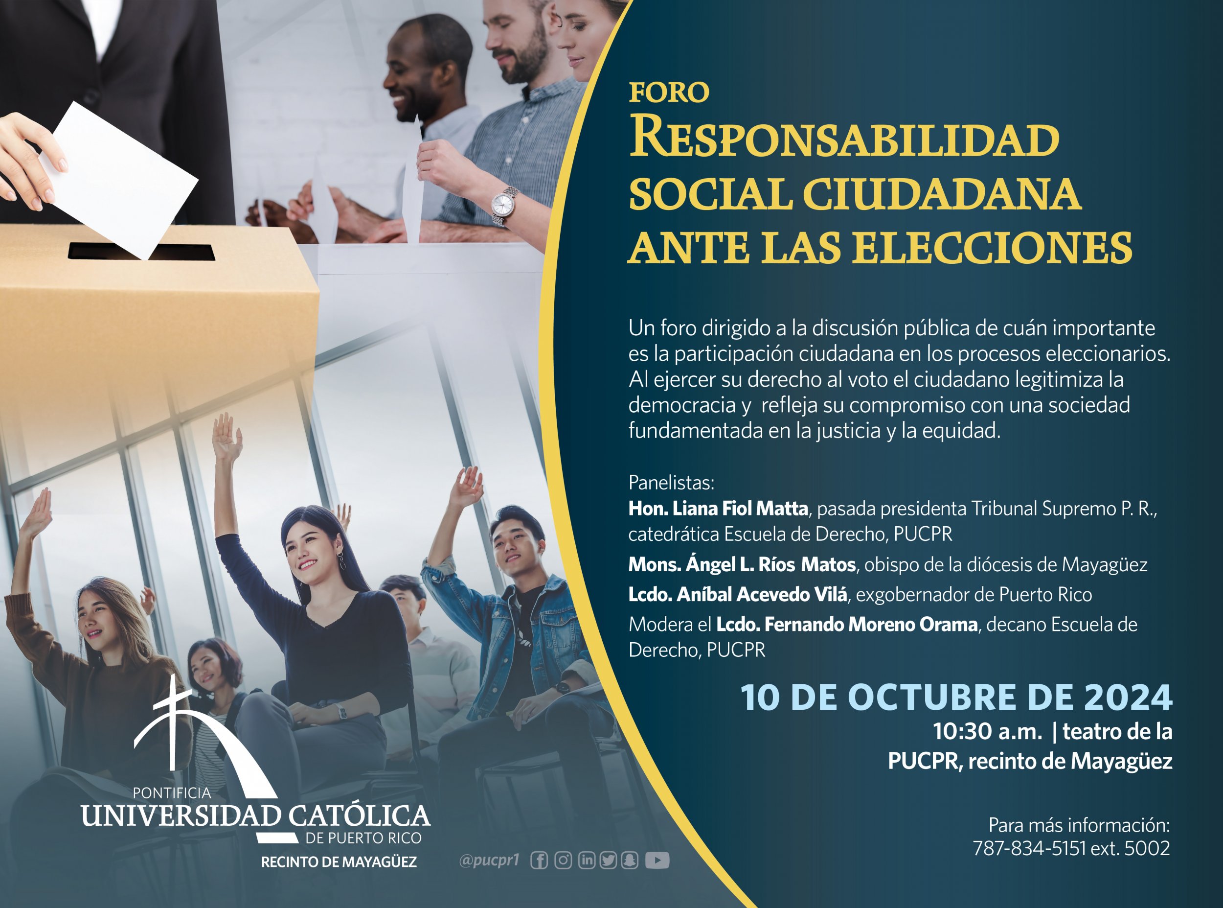 Responsabilidad social ciudadana ante las elecciones By celimer_torres@pucpr.edu | September 19, 2024 Panelistas discutirán la importancia de la participación ciudadana en los procesos eleccionarios Posted in General ← Sigue la Ruta CulturalSer relacionista brega..student edition →