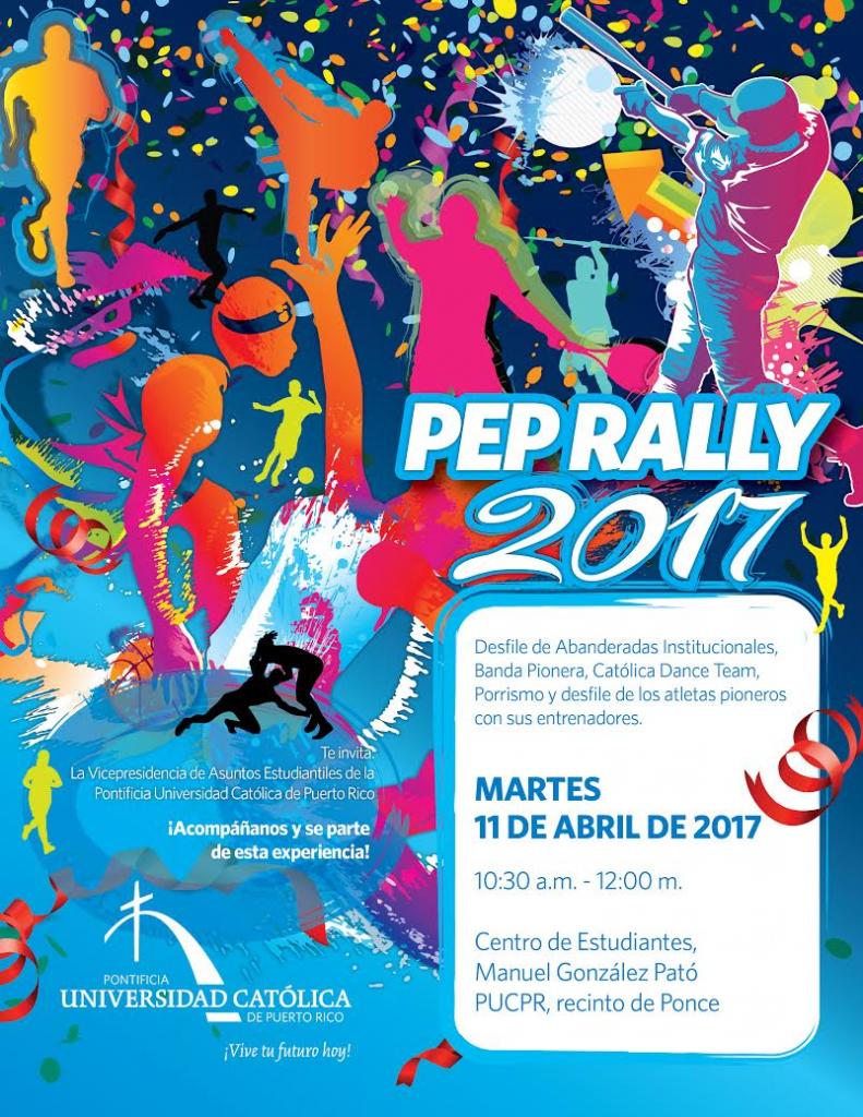 De cara a la celebración deportiva de mayor importancia para las universidades, La Católica celebrará el tradicional Pep Rally en apoyo a los atletas que representarán los colores azul y blanco en las Justas LAI. La actividad contará con un desfile que partirá desde el Complejo Deportivo hasta el Centro de Estudiantes. El desfile estará encabezado por la Banda Pionera y las abanderadas. A ellos se les unen los atletas que compitieron en el primer semestre y lo que participarán en los eventos de este semestre, los miembros del equipo de baile Católica Dance Team, los porristas y las abanderadas.