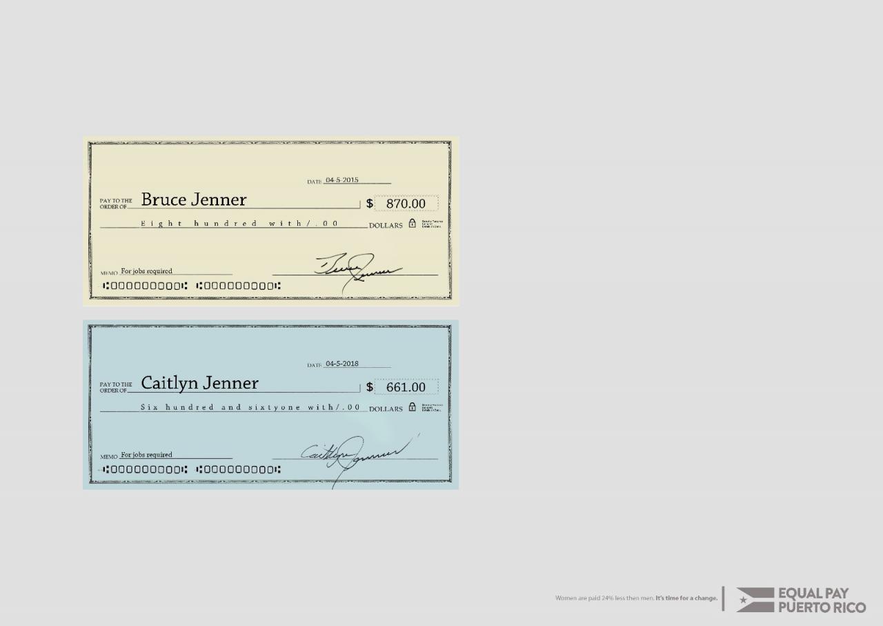 El anuncio “Págame igual” pretende crear conciencia sobre la desiguladad salarial por género en Puerto Rico y Estados Unidos. Presenta dos cheques; uno con el nombre de Bruce Jenner por la cantidad de $870.00, y otro de Citlyn Jenner de solo $661.00. “La idea que presentamos en la pieza se centró en la figura pública estadounidense del transgénero, Bruce Jenner. Es famoso por ser la figura paternal de las Kardashians. Utilizamos su figura de manera hipotética para enviar un mensaje claro de desigualdad salarial basado en género”, explicó Franceliz Gallardo.