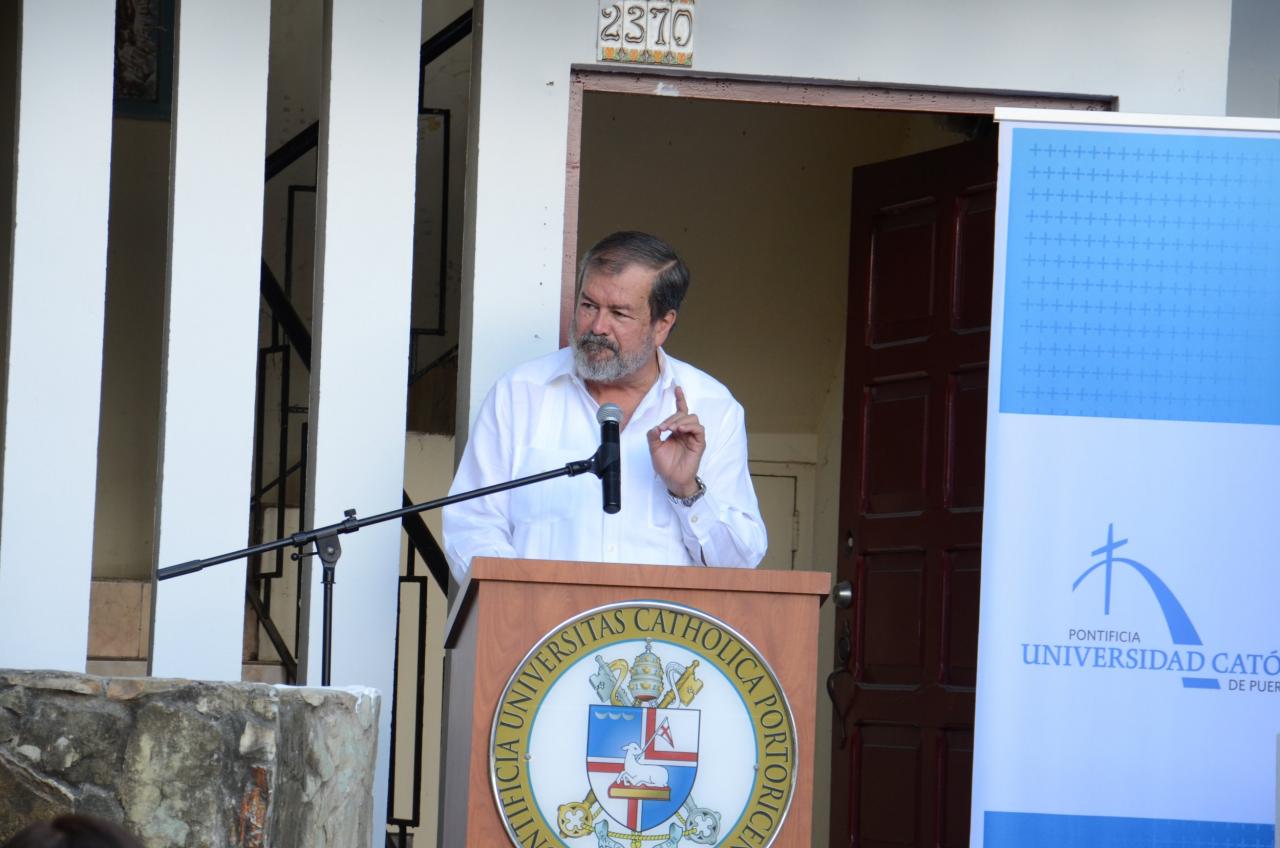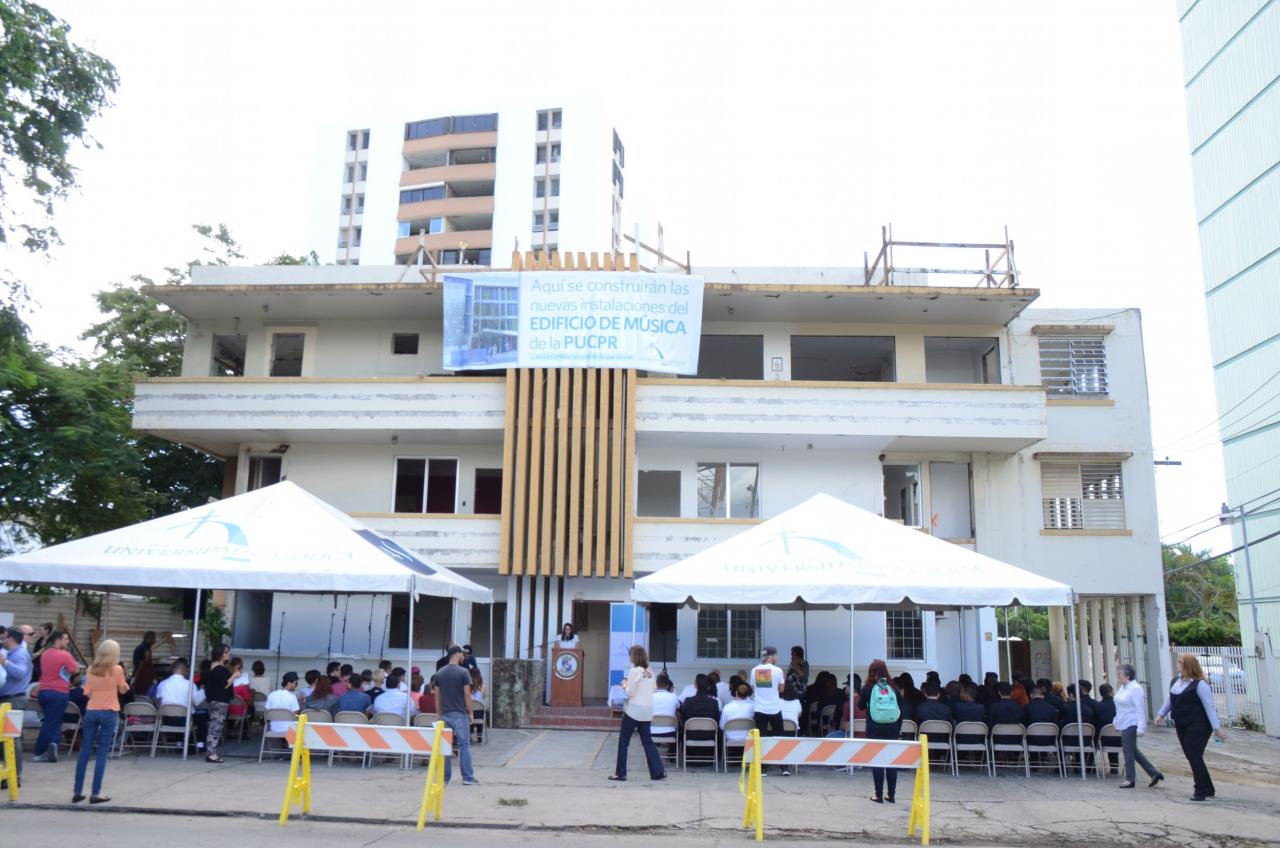 Durante la ceremonia de colocación de la primera piedra, el presidente de PUCPR, Jorge Iván Vélez Arocho explicó que para establecer el Edificio de Música se estará restaurando el Edificio del Carmen.