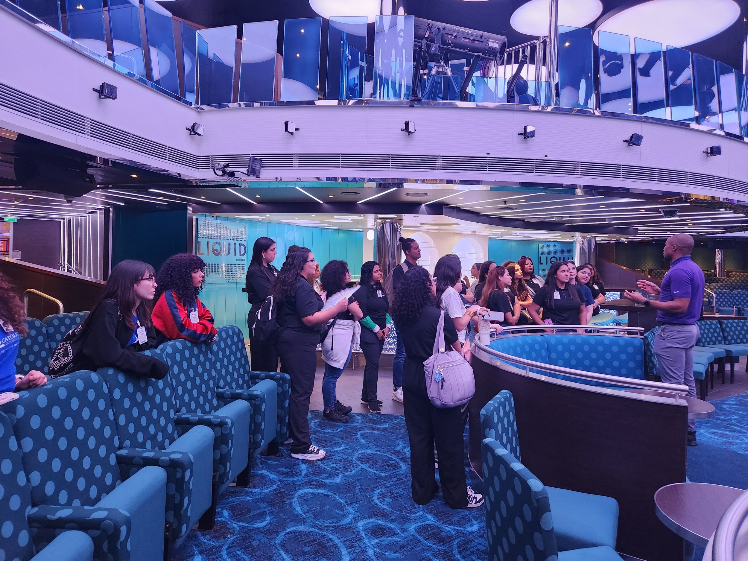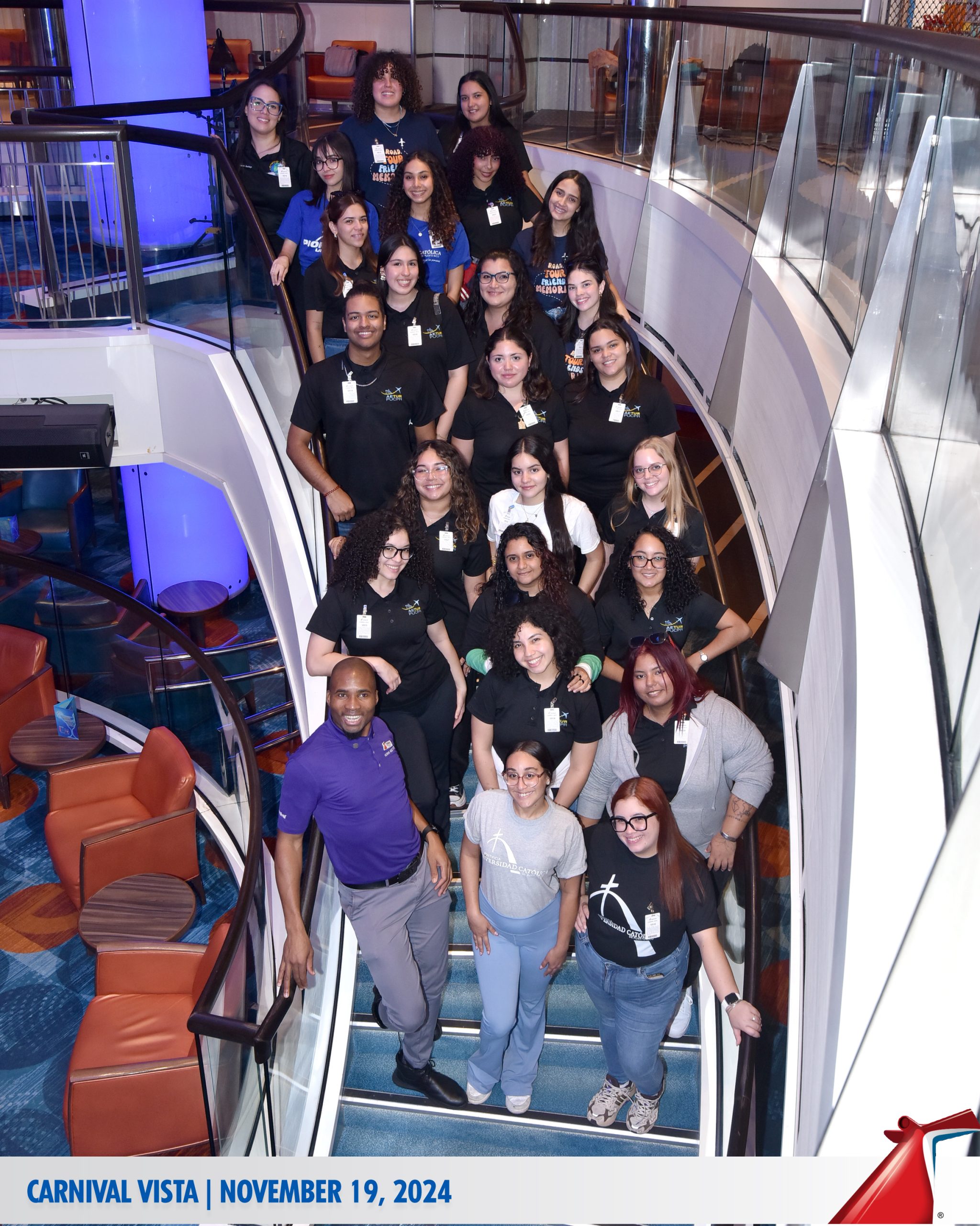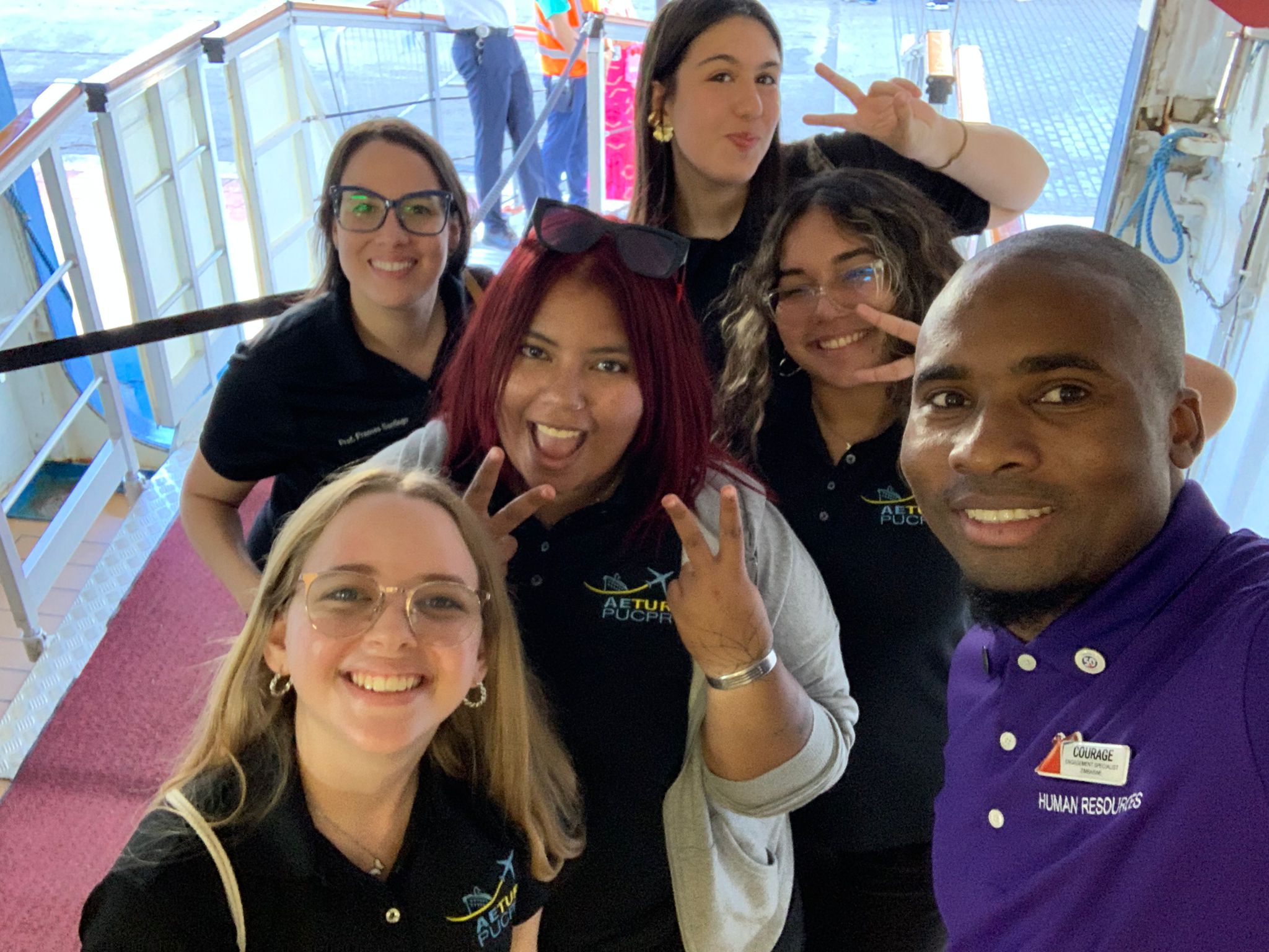 Como parte de las actividades de campo del curso de Cruceros del programa de Empresarismo Turístico, se coordinó una visita para que los estudiantes pudieran experimentar de cerca todo lo discutido en clase durante el semestre. Desde las facilidades del crucero, hasta las labores de los empleados y gerenciales. La iniciativa también fue parte de la Asociación de Estudiantes de Turismo (AETUR). “La división de Acceso Aéreo y Marítimo de la Compañía de Turismo de Puerto Rico (CTPR) quienes tienen como misión aumentar el flujo de tráfico aéreo y de cruceros a la Isla, fueron los encargados de crear el contacto entre la línea de crucero y el grupo de estudiantes. Crystal Bell, directora de Acceso Aéreo y Marítimo, es exalumna de nuestra Escuela Graduada del Colegio de Administración de Empresas y fue quien permitió que se lograra la visita de los estudiantes del curso de Crucero y otros estudiantes miembros de la Asociación de Estudiantes de Turismo (AETUR). Durante el recorrido fueron acompañados por la Sra. Tamara Bird, consultora Senior de Cruceros para la CTPR, y los recibió el Sr. Courage, quien forma parte del equipo de Recursos Humanos para el Carnival y nos ofreció un resumen sobre la función de cada departamento, la vida de los empleados a bordo y mostró todas las áreas de disfrute para huéspedes” explicó la Dra. Frances Santiago, catedrática del Colegio de Administración de Empresas.