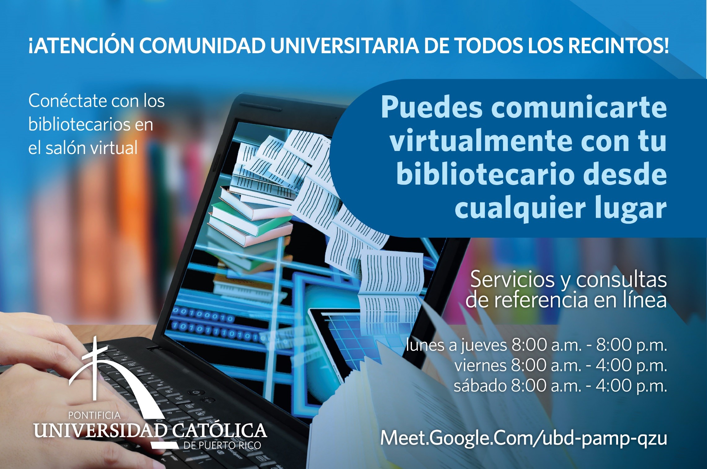 Servicios bibliotecarios al alcance de un click By celimer_torres@pucpr.edu | August 19, 2021 Accede a tu biblioteca desde cualquier lugar Posted in General ← Misa de Inicio de Curso y celebración del 60 aniversario de la Escuela de Derecho“Apostemos con todas nuestras fuerzas por la esperanza de que un mundo mejor es posible porque el bien es posible” →