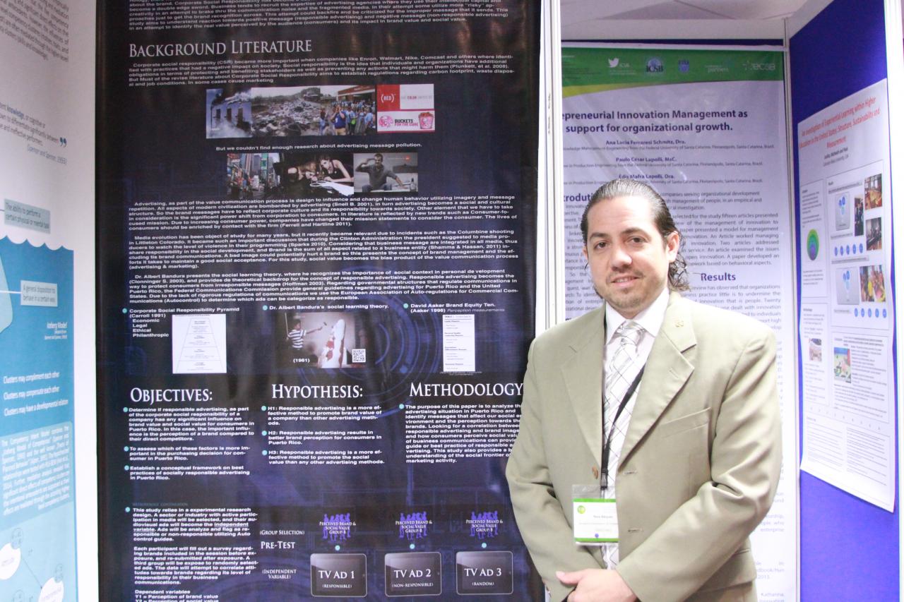 René Barguéz, estudiante de doctorado en Administración de Empresas de la PUCPR presentó su investigación doctoral en la 59 Conferencia Mundial del International Council of Small Business celebrado en Dublín, Irlanda del 11 al 14 de junio de 2014. El prestigioso evento de negocios reunió a importantes académicos e investigadores del mundo entero para discutir nuevas tendencias y compartir ideas sobre asuntos relacionados con la administración de empresas. Con su estudio titulado “Publicidad responsable y el efecto dual: valor de marca y valor social en Puerto Rico”, René compartió sus innovadoras estrategias de publicidad y cómo esto puede contribuir a la sociedad mientras cumple con el propósito de reconocimiento de marca y retorno de inversión.