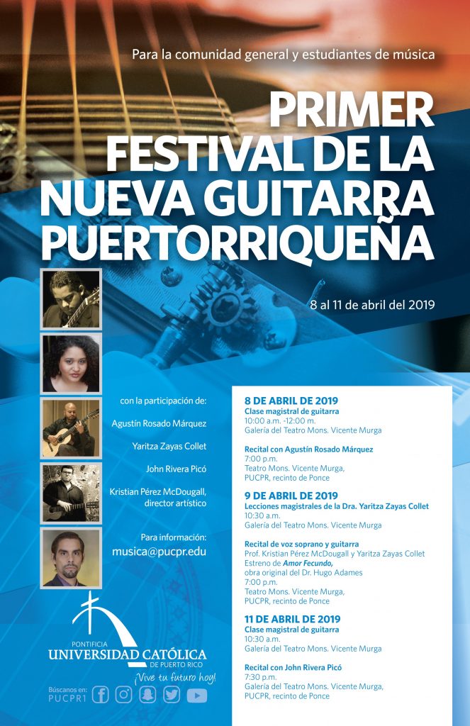 ¡Suenan las guitarras! By celimer_torres@pucpr.edu | April 5, 2019 Arriba el telón para el primer Festival de la Nueva Guitarra Puertorriqueña. Posted in General ← Bajo análisis problemática ambiental¡Cuidadores somos todos! →