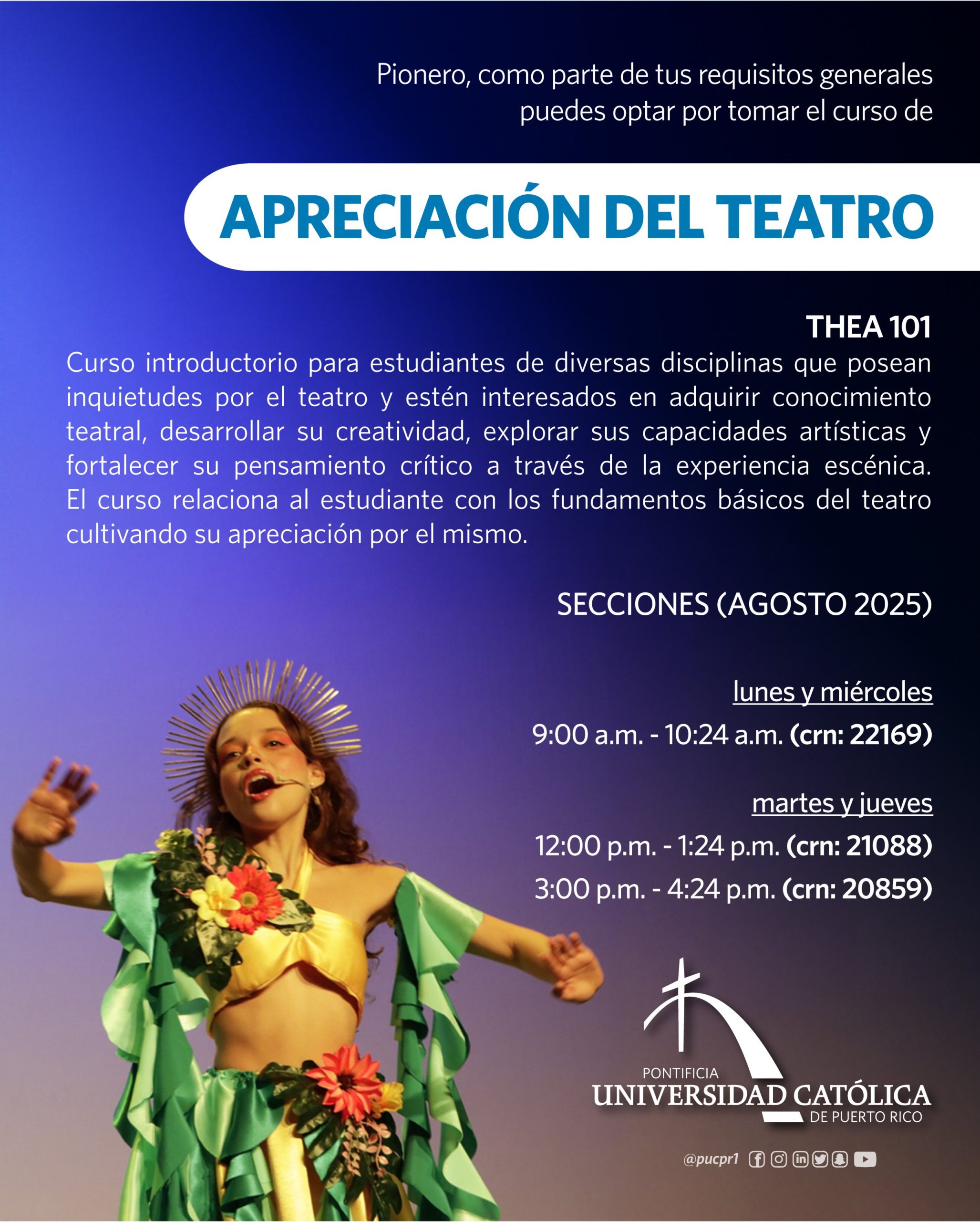 ¿Tienes curiosidad por el teatro? By celimer_torres@pucpr.edu | June 5, 2025 ¡Matrículate en el curso Apreciación del Teatro, explora este arte y desarrolla tu creatividad Posted in General ← Pioneras se lucen en el Festival CúspideLA CATÓLICA LLEGA AL ÁREA METRO →