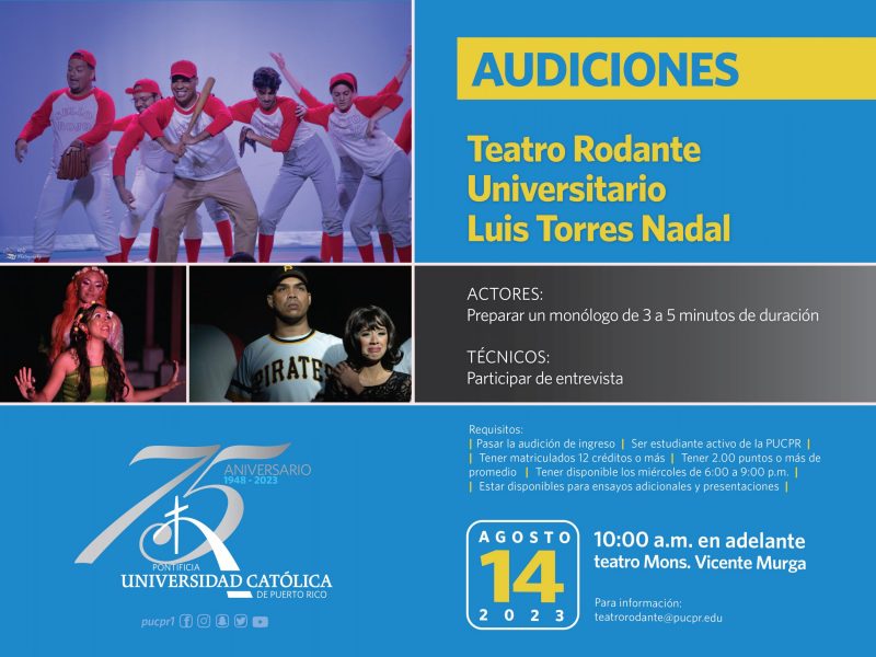 ¿Tienes habilidades para la actuación y el teatro? By celimer_torres@pucpr.edu | June 16, 2023 ¡Ven y demuestra tu talento! Posted in General ← ¡Integra conocimientos en teatro a tu profesión!Inician las ceremonias de graduación de la Pontificia Universidad Católica de Puerto Rico →