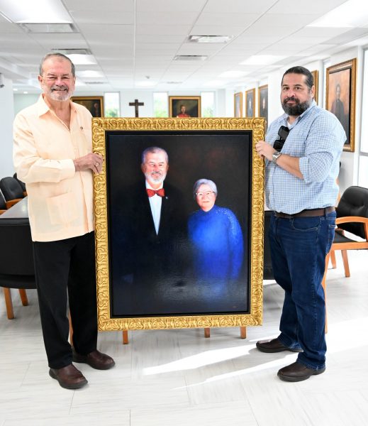 Rodeado por estas pinturas de la autoría del afamado pintor Jaime Rosa, el presidente presentó el mas reciente fresco: su pintura como actual presidente de la PUCPR junto a su esposa, Digna “Angie” Hernández. “Me preguntan ‘¿por qué usted quiso que esta pintura fuera de usted y de su esposa? Bueno, porque esta misión la asumimos juntos. Mi esposa ha sido la gran compañera colaboradora de toda mi vida profesional y personal, así que queríamos significar que, en este periodo de 14 años y medio, hemos estado juntos. Aprovecho para expresarle mi profundo agradecimiento al pintor Jaime Rosa que hizo todas estas obras. Esta obra culmina toda esta exhibición. Al lado están los espacios de las personas que en el futuro ocuparán la presidencia, ya sea presidente o presidenta”, apuntó.